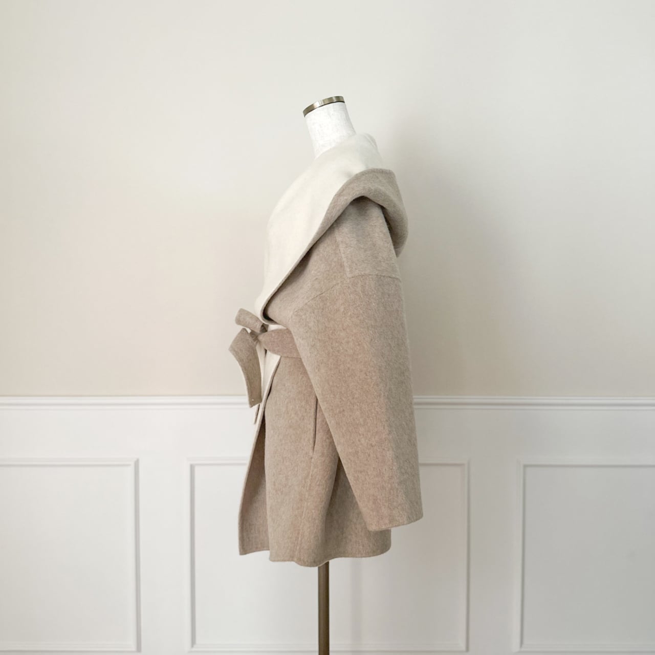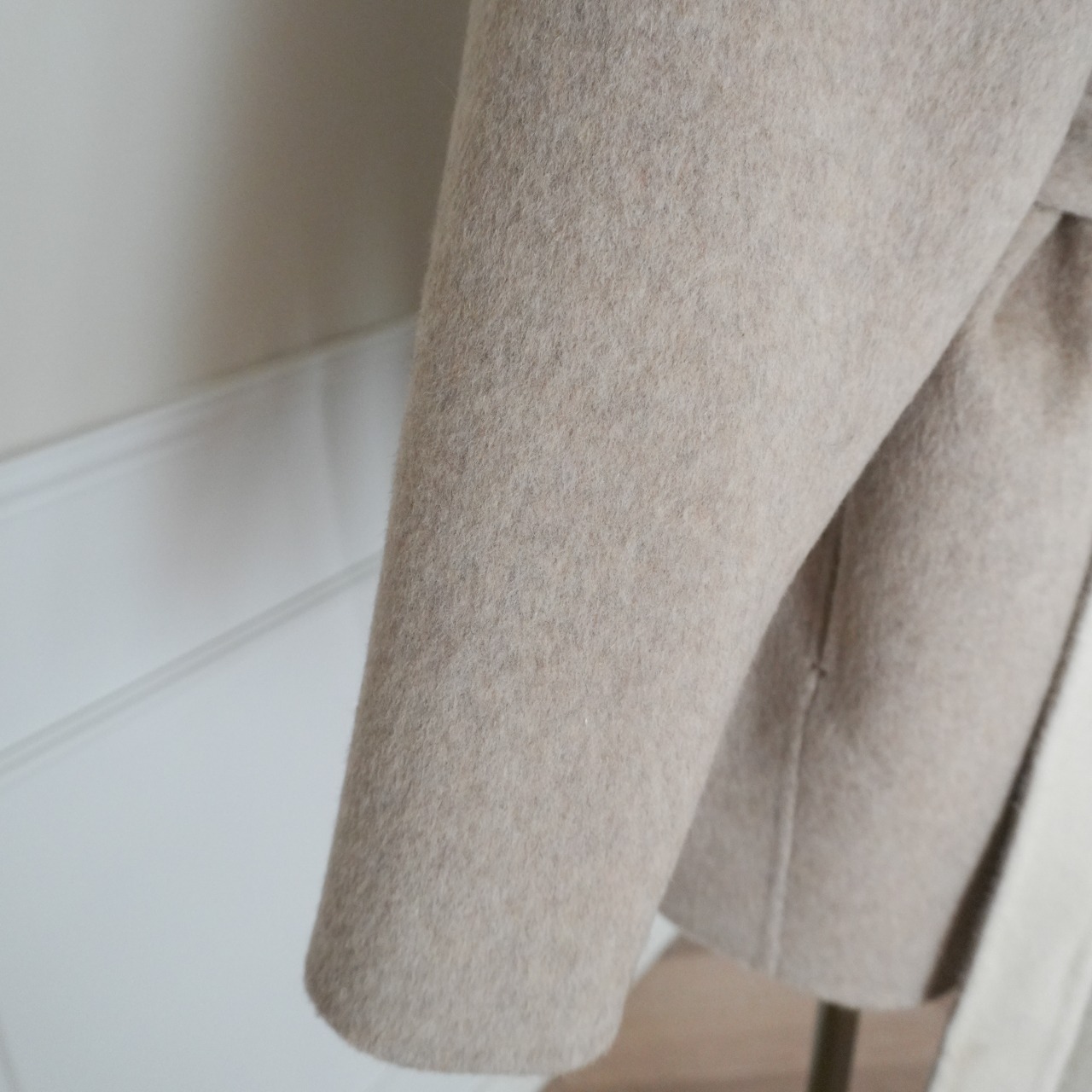 毛足が少し長めのウールは、ふんわりと包み込むような柔らかさと暖かさを備え、襟元から肩にかけてのラインが、美しく立体的なシルエットを生み出します。