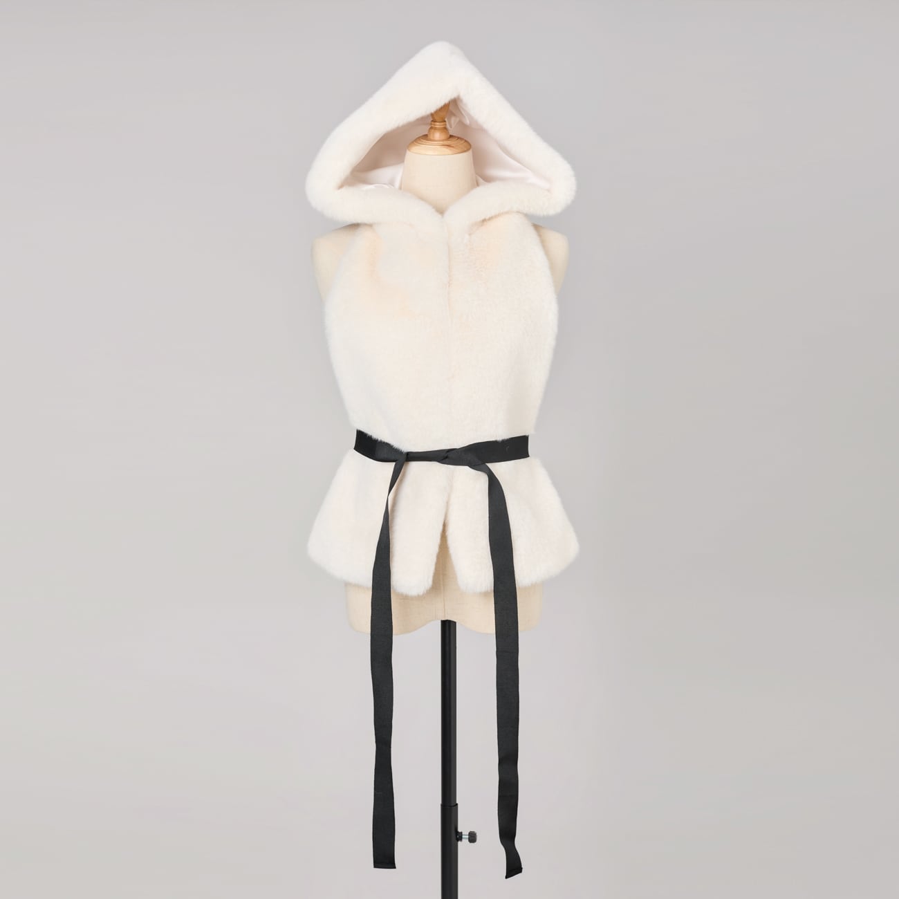 ファーリボンを結ぶことで、ウエスト位置を高く見せ、スタイルアップ効果も。