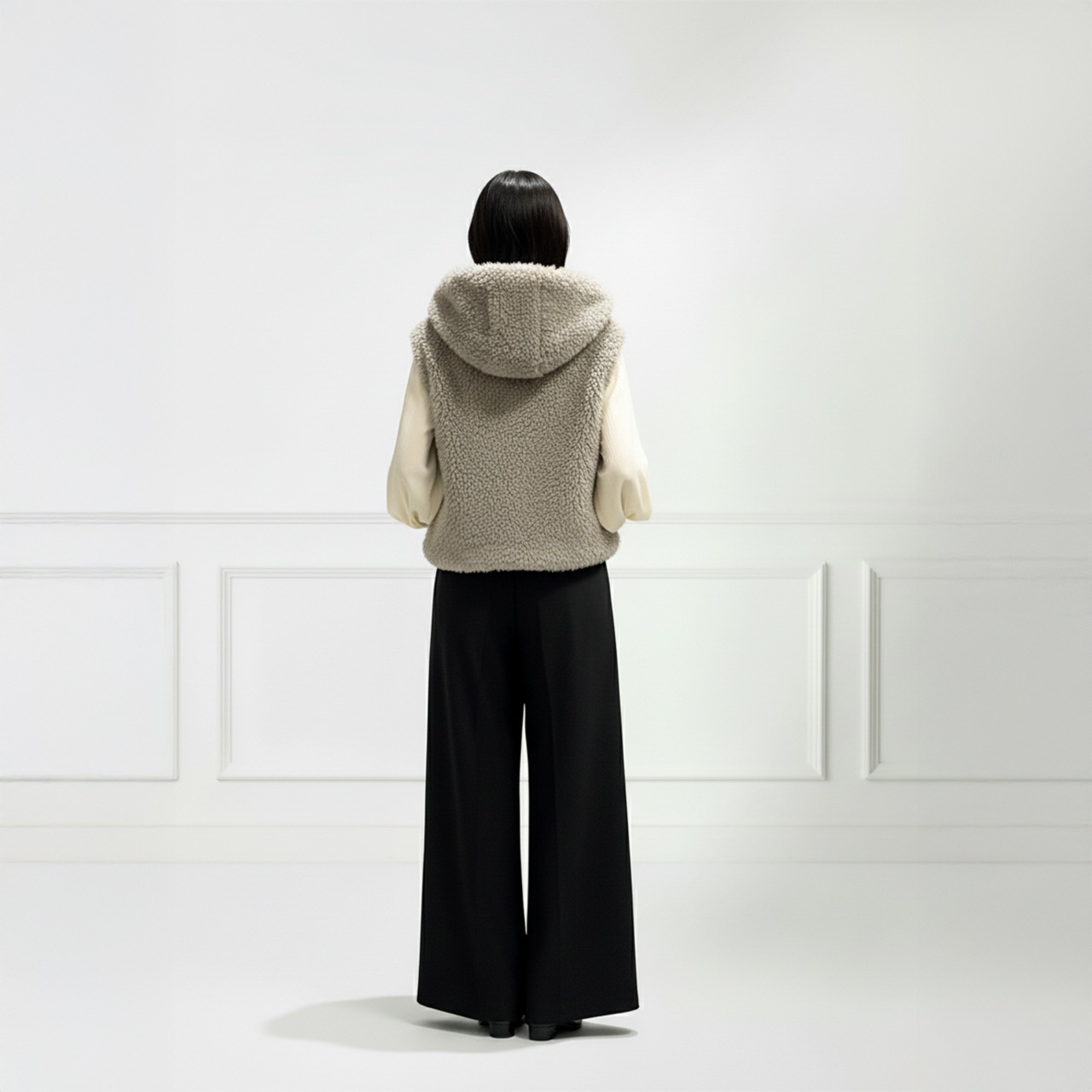 軽くてあたたかい、大人のためのフード付きボアベスト。