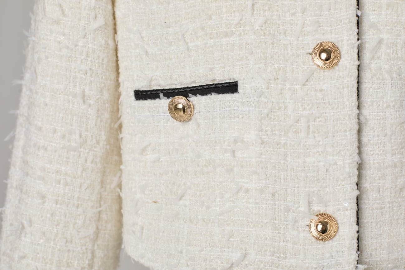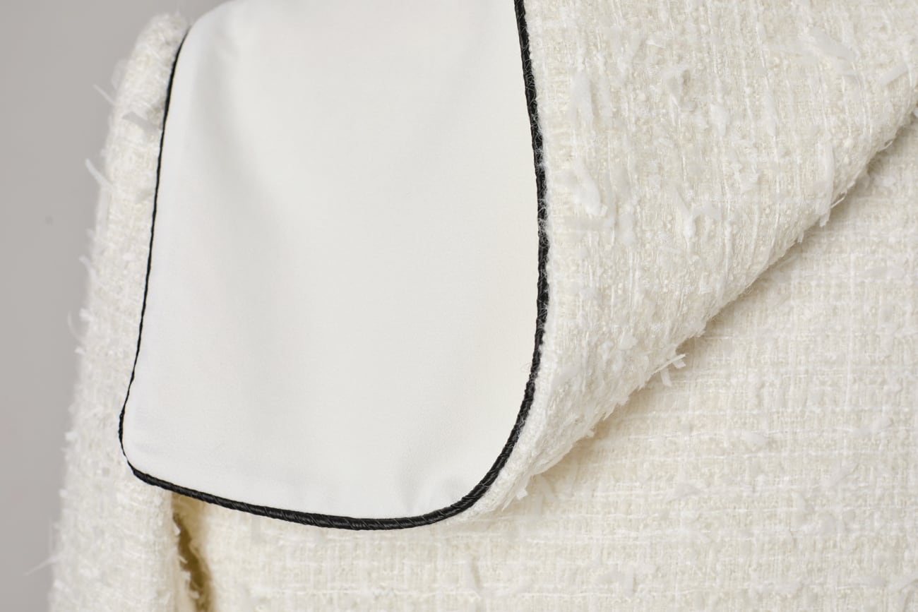 素材には、程よい厚みと高い密度を備えた中厚ツイードを厳選。繊細な意匠糸を複雑に織り込むことで、光を受けるたびに奥行きのある表情が生まれます。凹凸のある立体的な編地は、安価な素材では表現できない確かな肉厚感を備え、軽やかさと保温性を両立。シワになりにくく、型崩れしにくい設計で、手に取った瞬間にも“質感の違い”を感じていただけます。