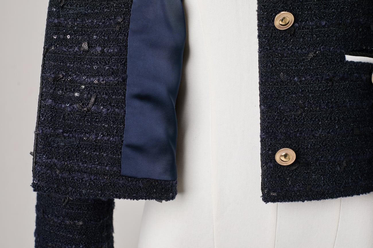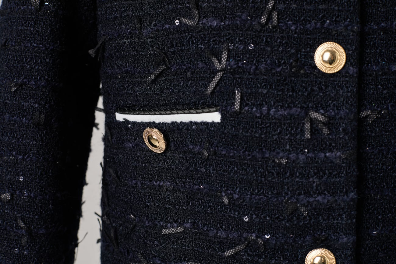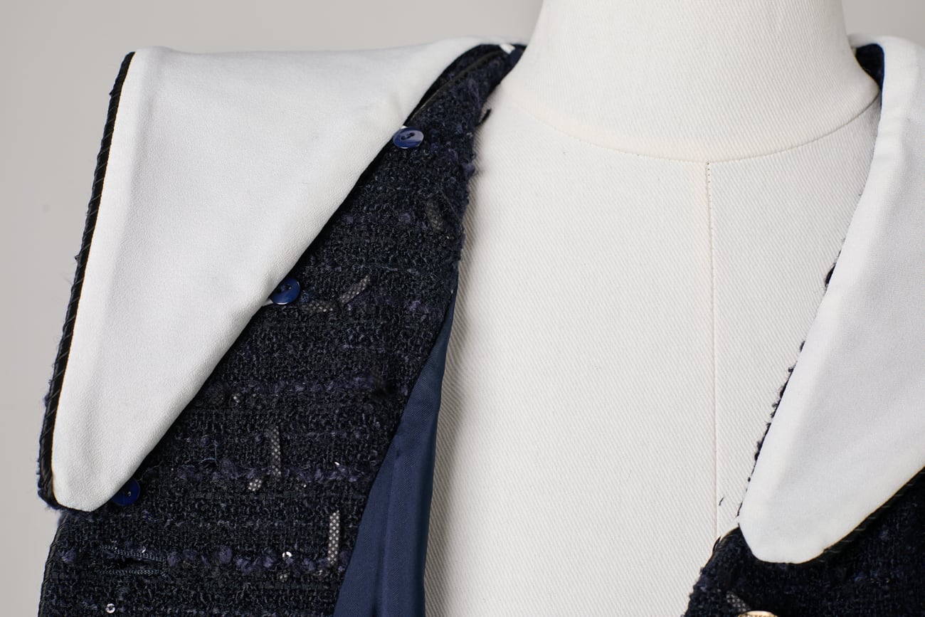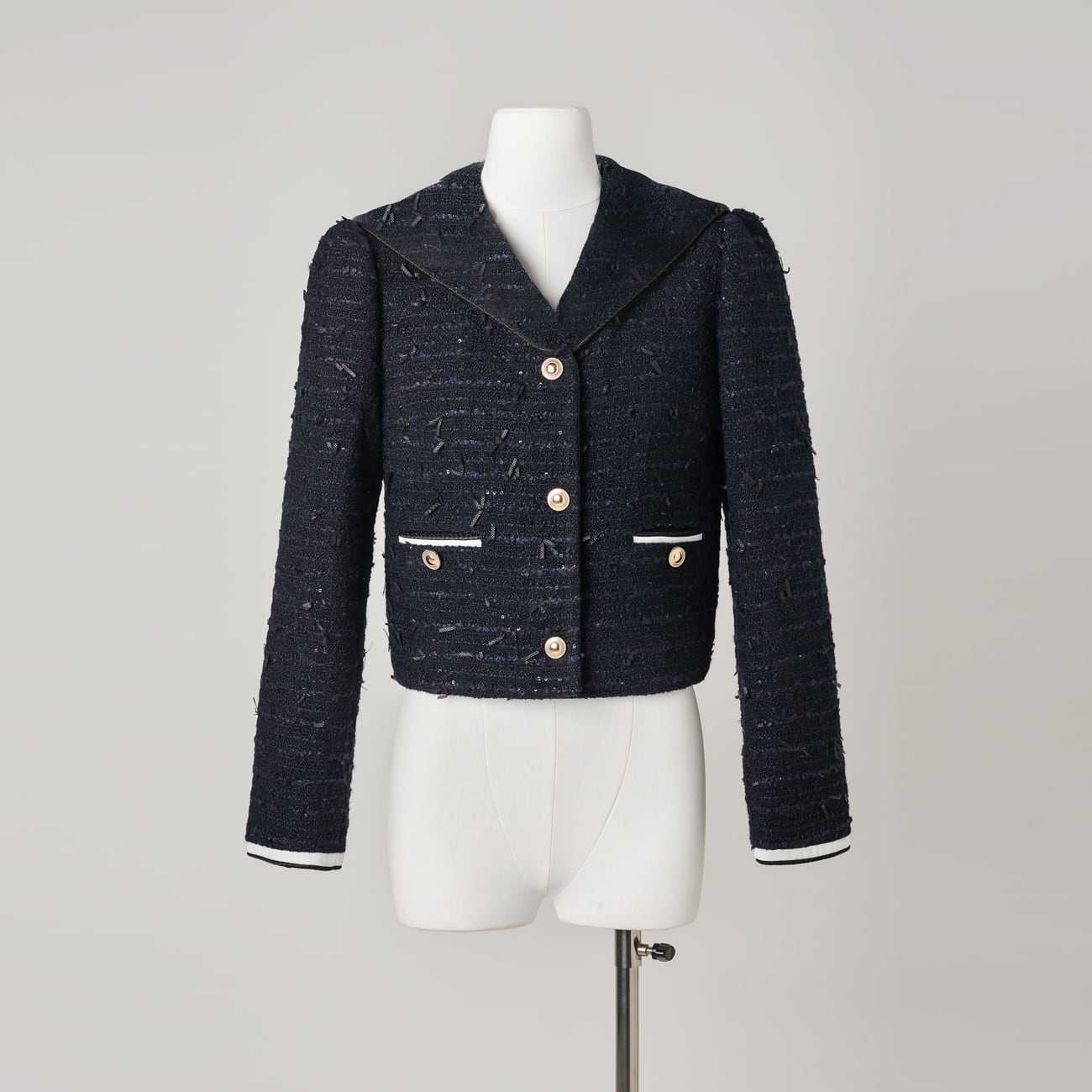 絶妙な高さに立ち上がった肩山も大きなデザインポイント。ほんの数ミリの差を何度も調整し、甘くなりすぎないモード寄りのフォルムに仕上げました。袖口やポケット、センターに施したバイカラーのパイピングと、上品な光を放つゴールドボタンが全体を凛と引き締め、洗練されたマリンテイストへと昇華させます。
