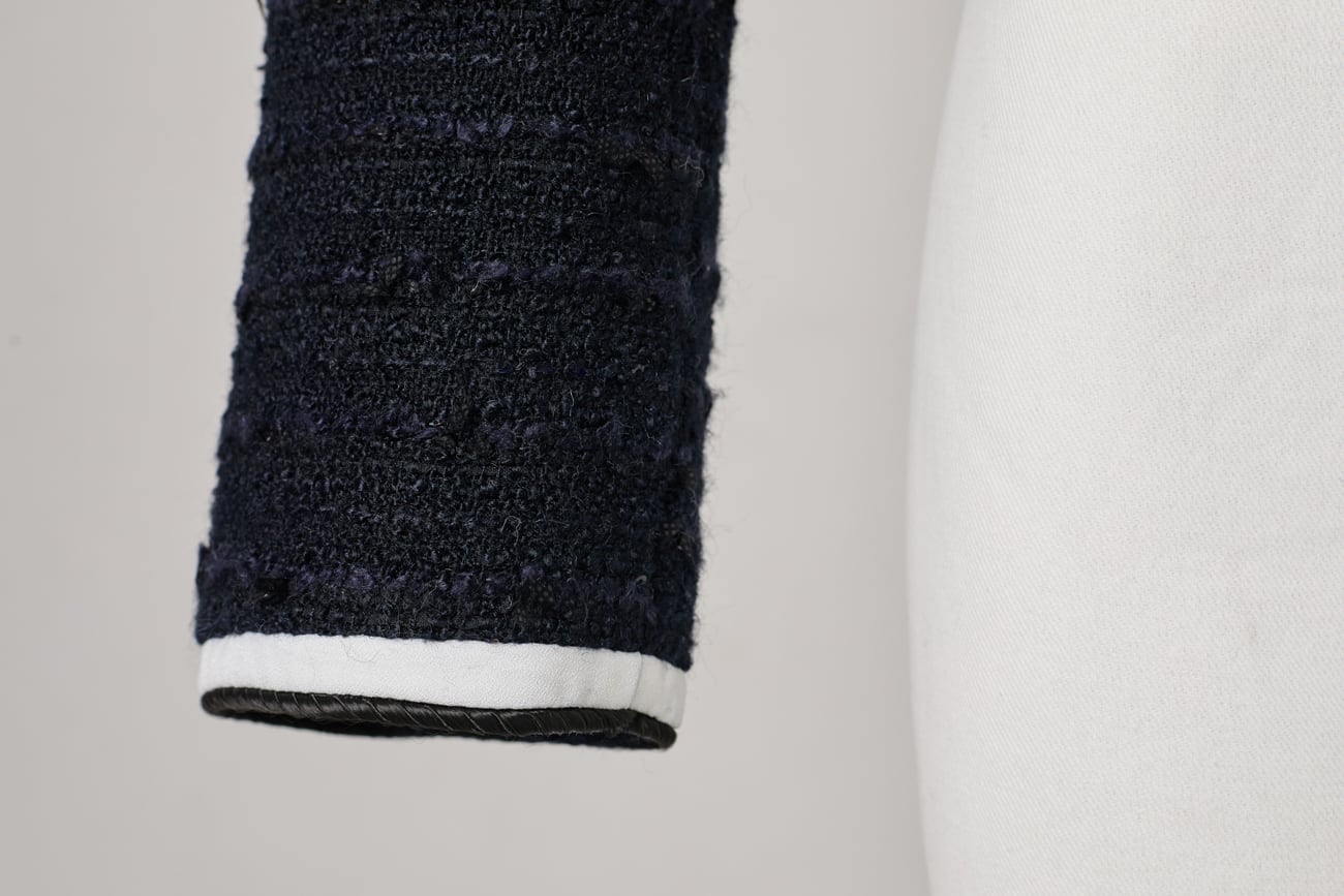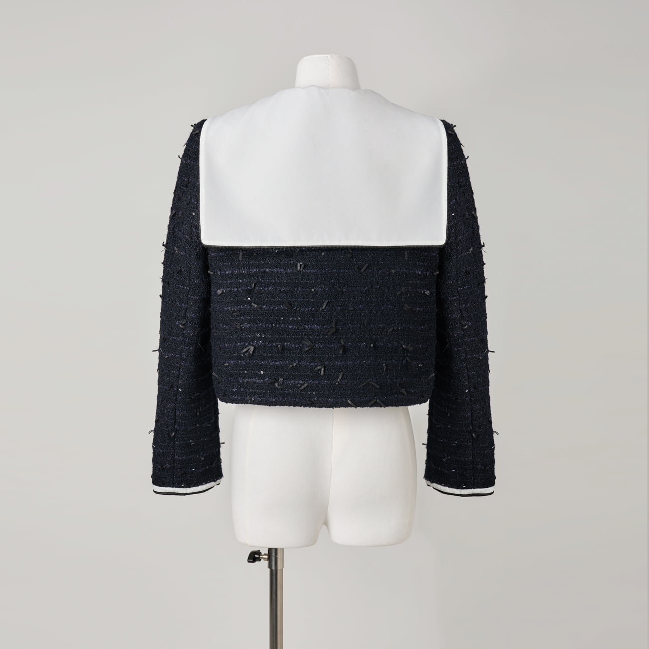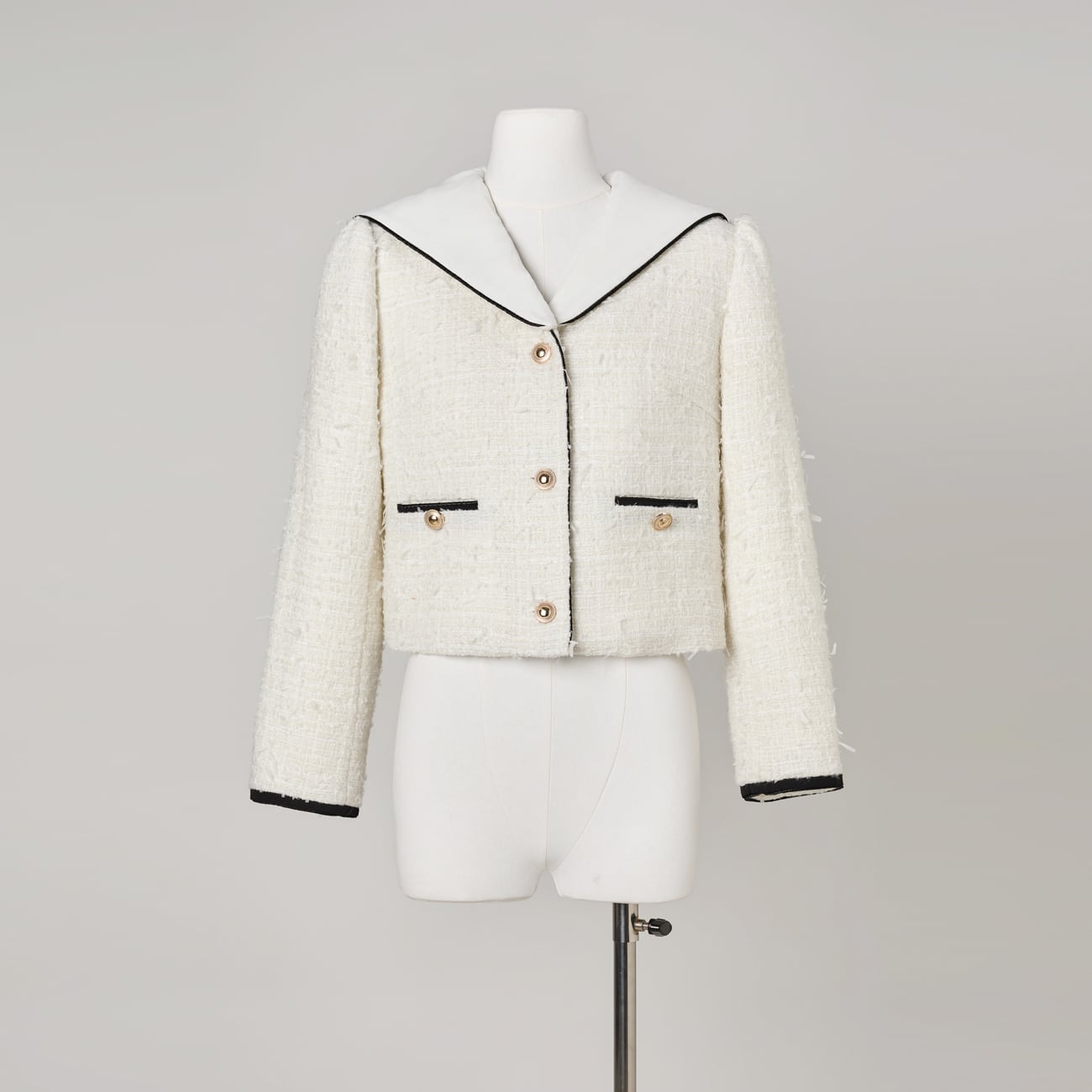 絶妙な高さに立ち上がった肩山も大きなデザインポイント。ほんの数ミリの差を何度も調整し、甘くなりすぎないモード寄りのフォルムに仕上げました。袖口やポケット、センターに施したバイカラーのパイピングと、上品な光を放つゴールドボタンが全体を凛と引き締め、洗練されたマリンテイストへと昇華させます。