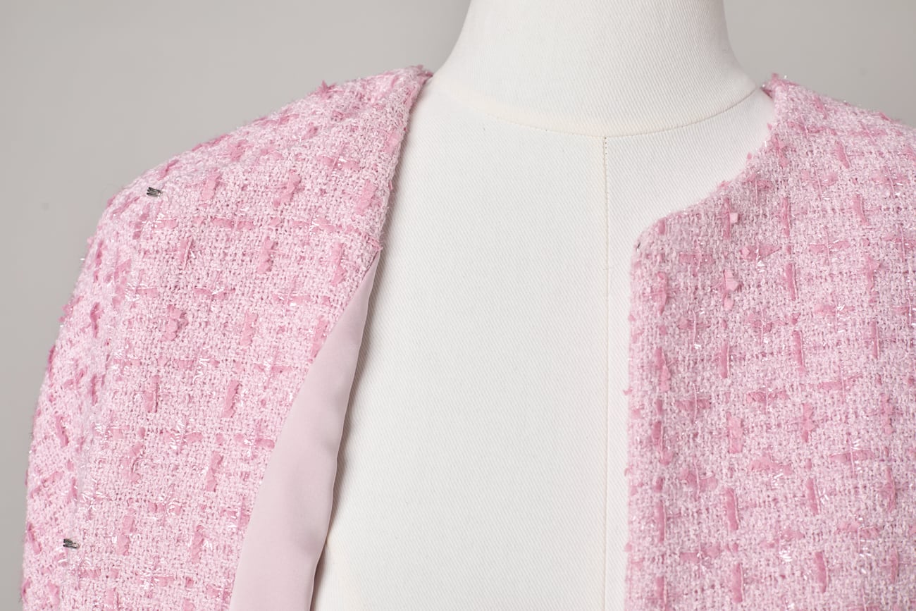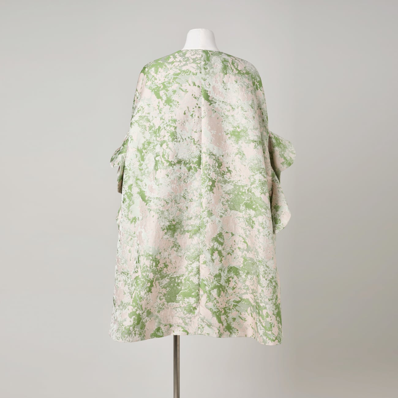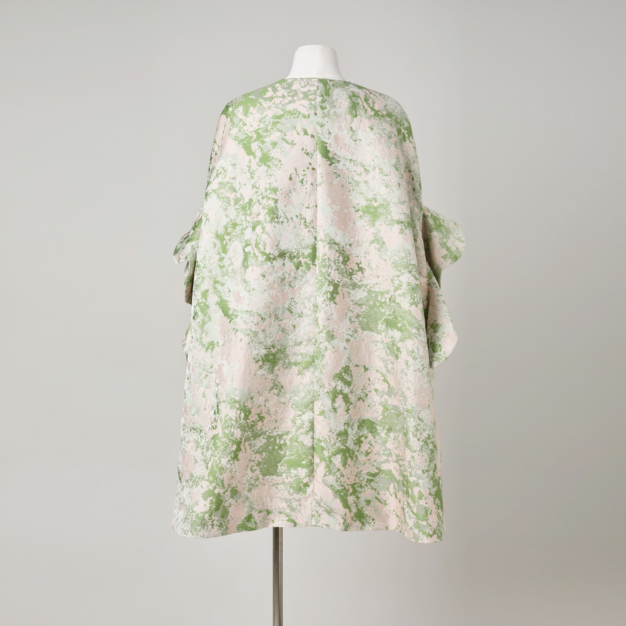 モスグリーンと淡いピンクが重なり合う抽象的な織りが、光を受けるたびに奥行きと揺らぎを生み、まとうだけで視線を惹きつけます。