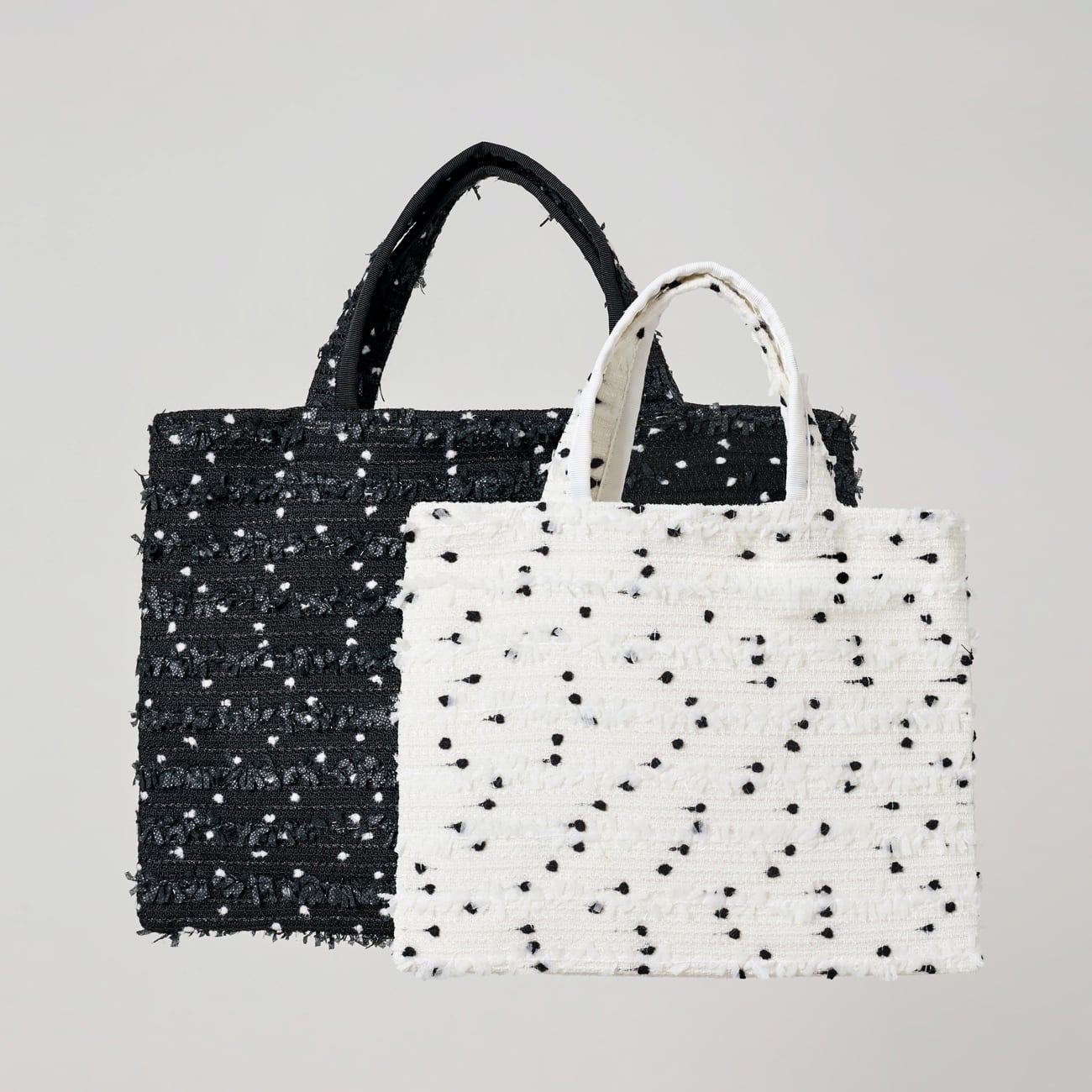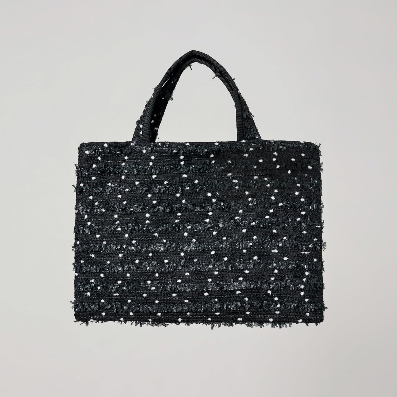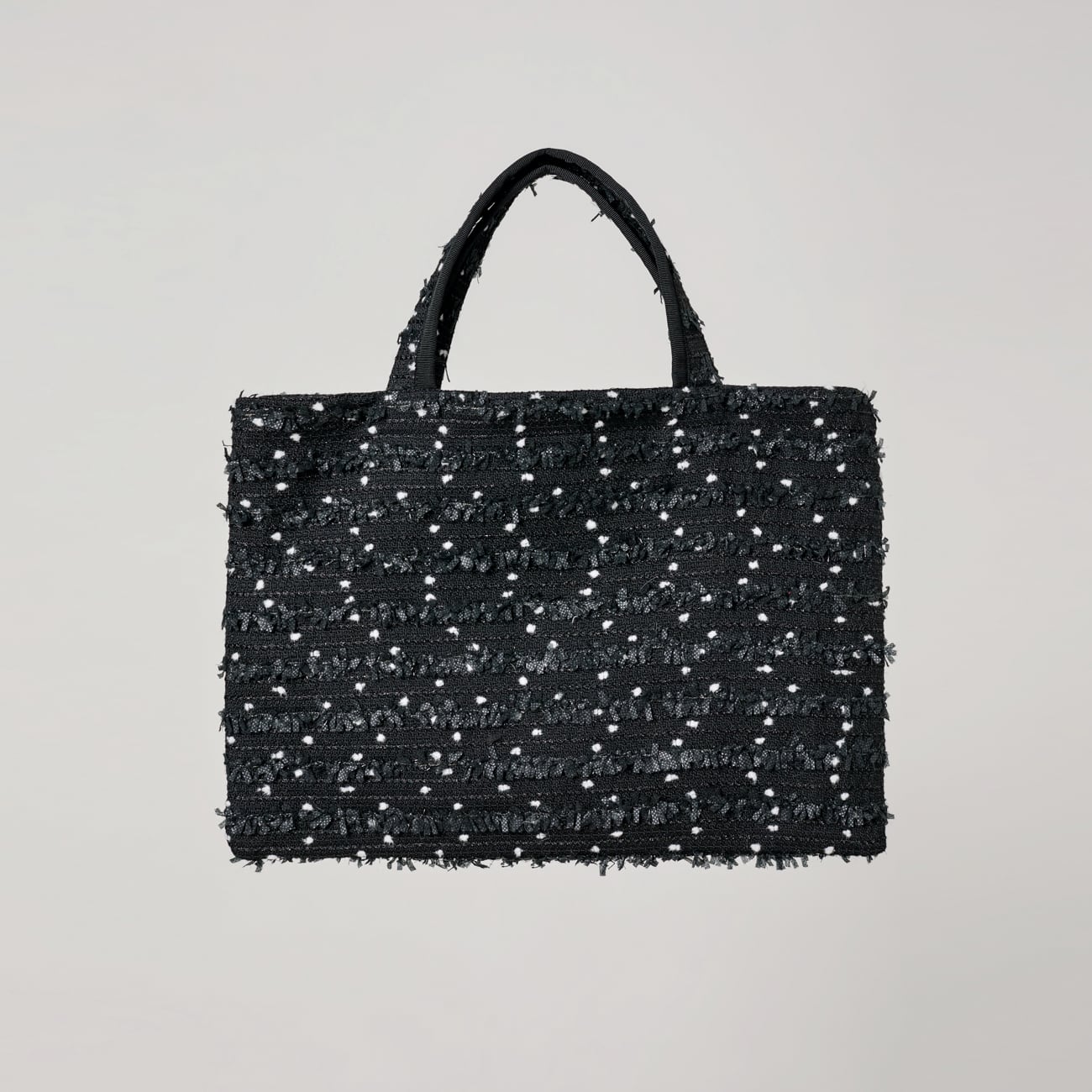 立体感のあるドットツイード生地を使用した、レギュラーサイズのトートバッグ。凹凸のある織りと散りばめられたドットが奥行きを生み、上品で落ち着いた華やかさを演出します。