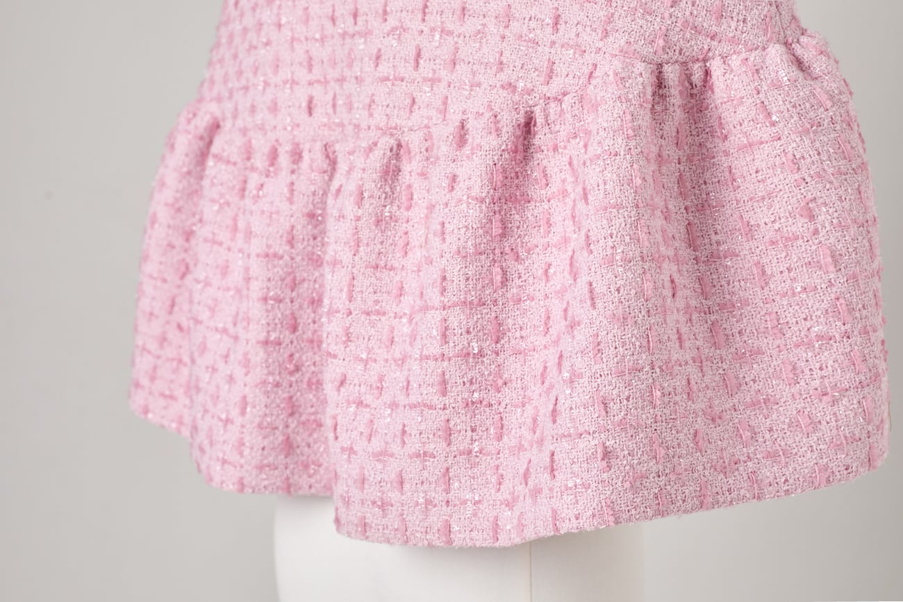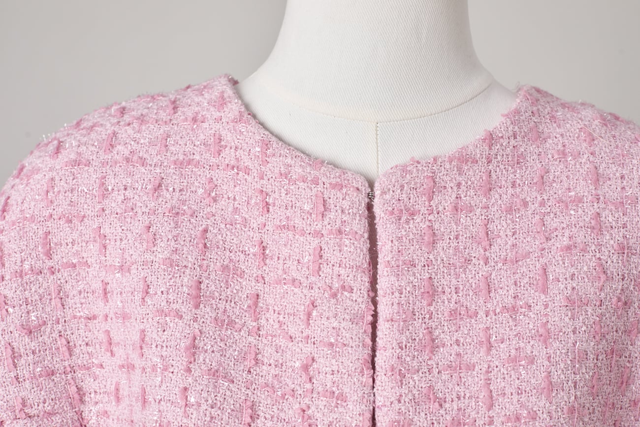 ショート丈設計によりウエスト位置を高く見せ、ロングスカートやワンピースとのバランスも秀逸。セレモニーや特別な日の装いにも映える、構築美を備えたツイードケープジャケットです。