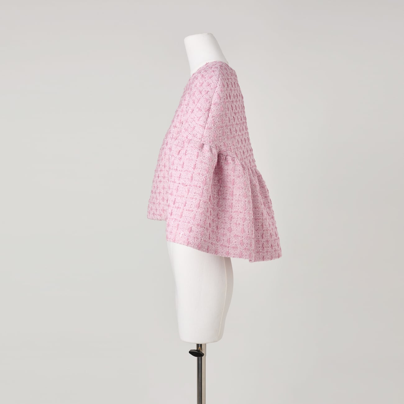 立体感のある上質ツイードを使用した、ショート丈のケープジャケット。織りの凹凸が生む奥行きと柔らかな質感が、光を受けるたびに上品な表情を演出します。