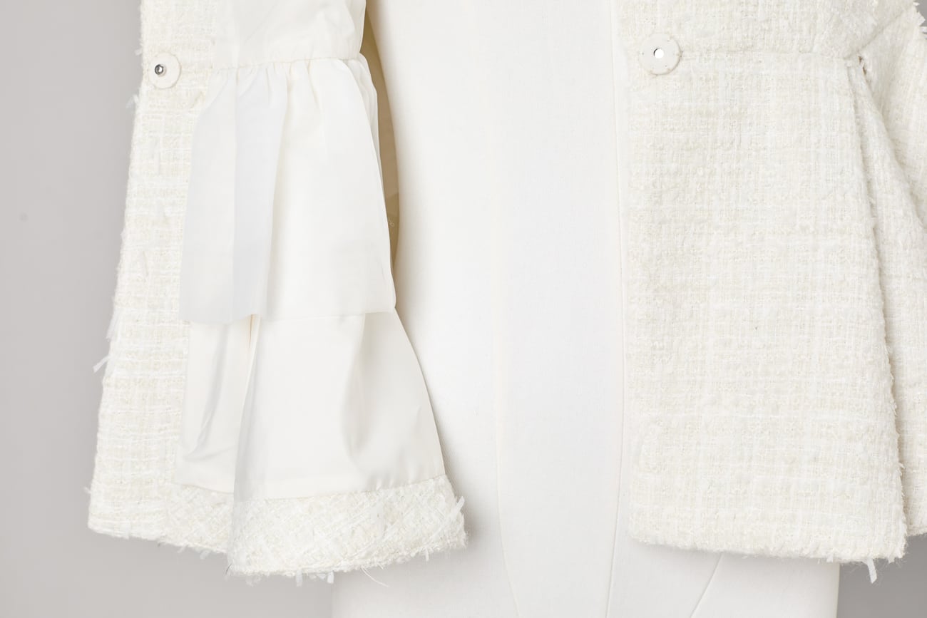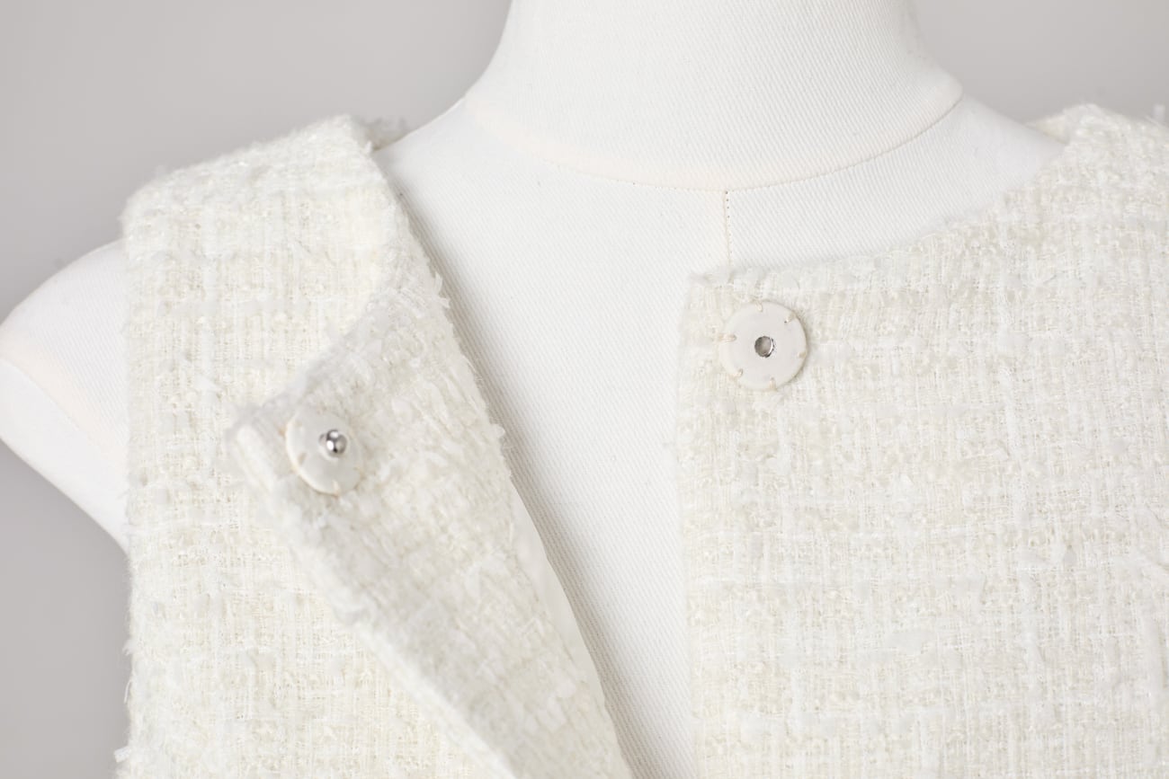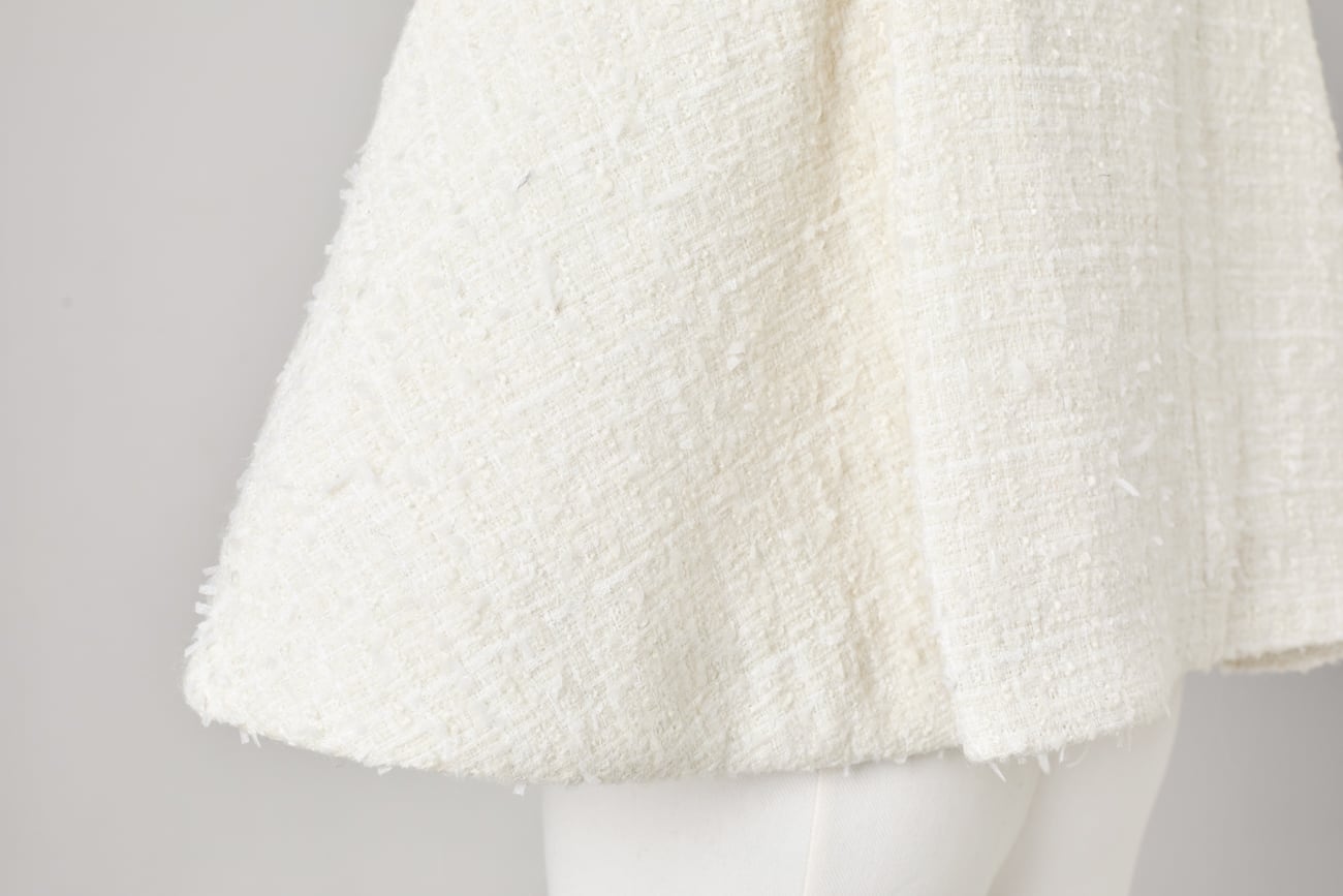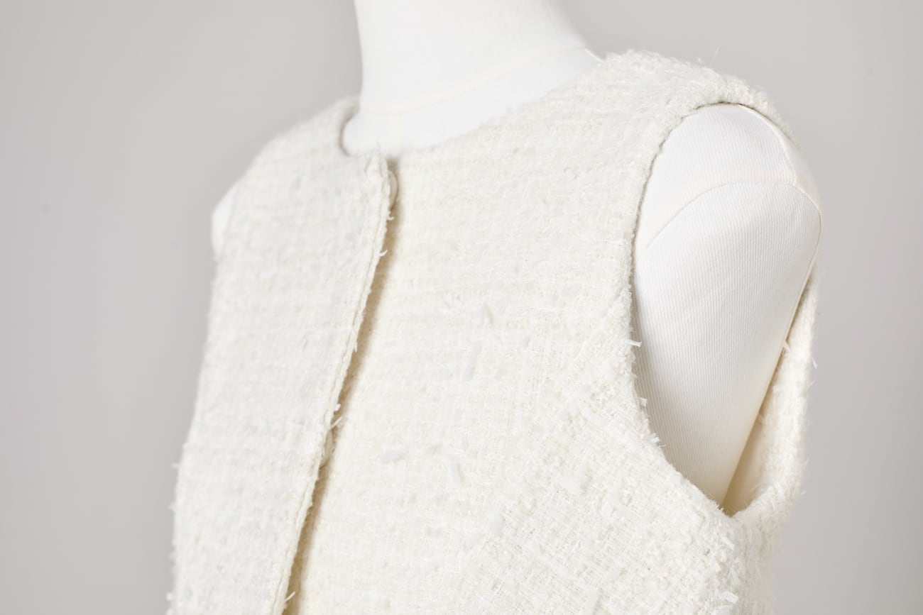 上質なツイード生地を使用した、構築的なペプラムシルエットのツイードジレ。立体感のある織りが奥行きを生み、柔らかな光を含んだ上品な表情を演出します。