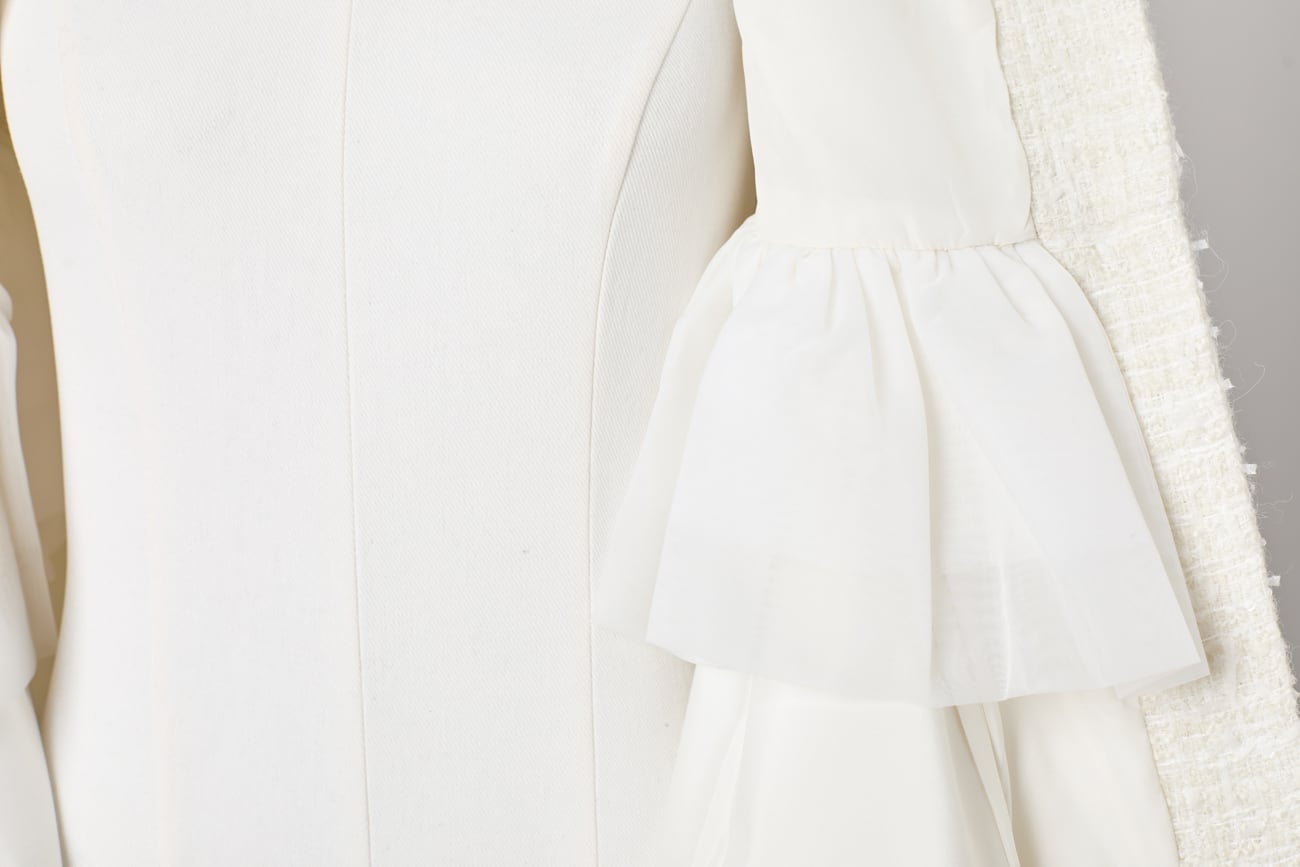 ウエスト切替部分には内側にチュールを仕込み、計算されたボリュームを形成。自然な広がりではなく、構造によって生み出された美しいペプラムラインが、横から見たときにも立体的なフォルムを描きます。