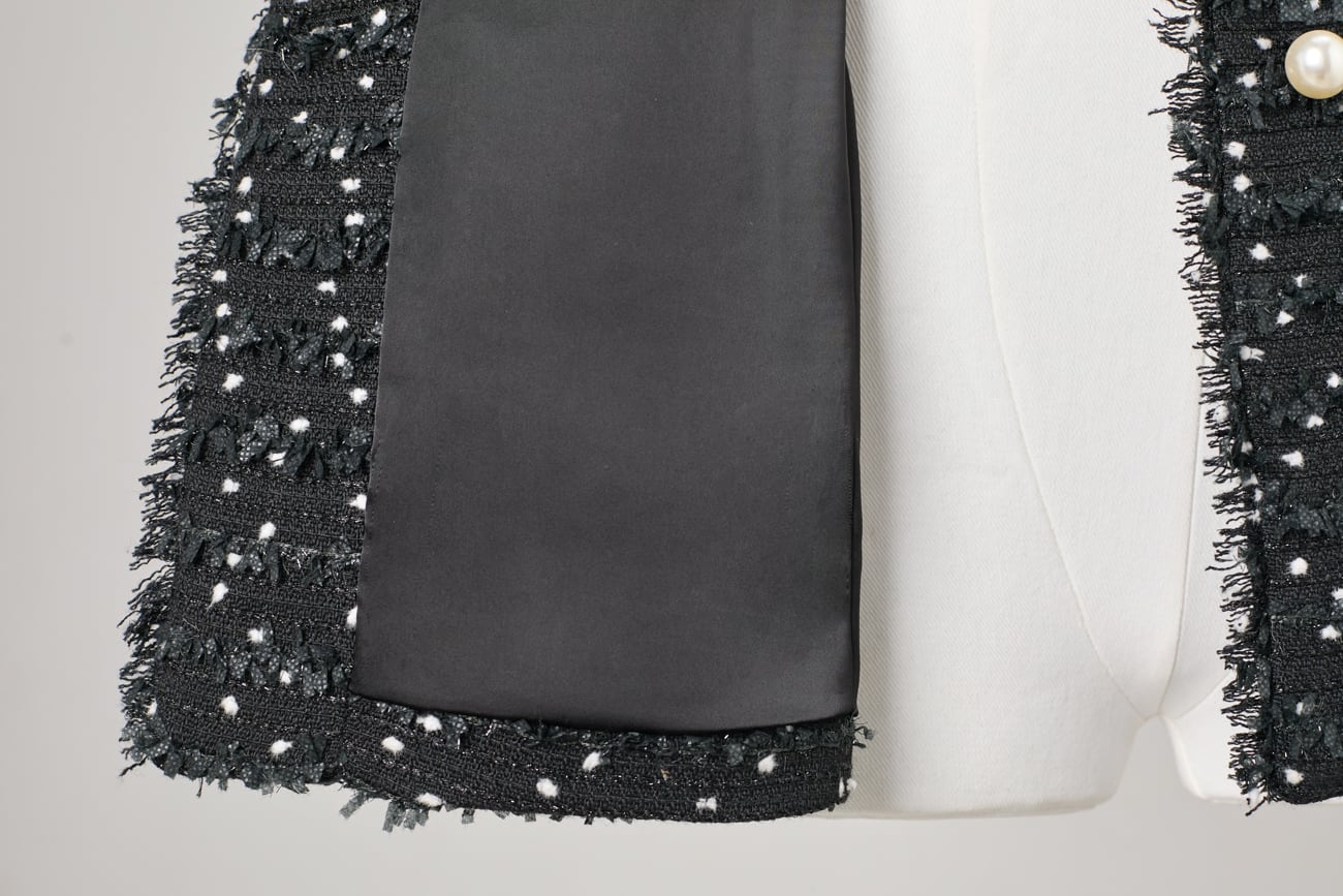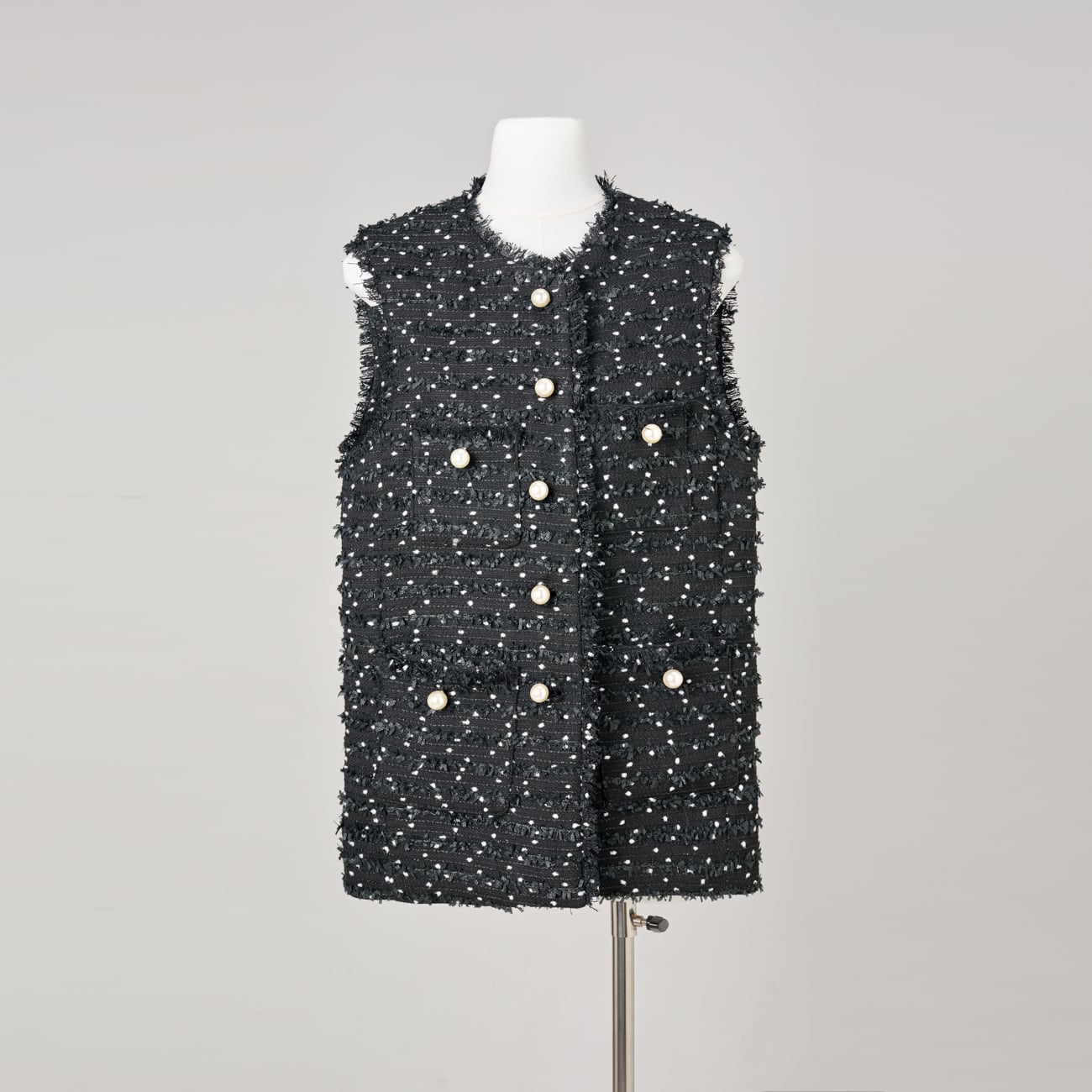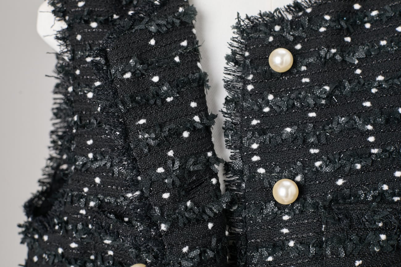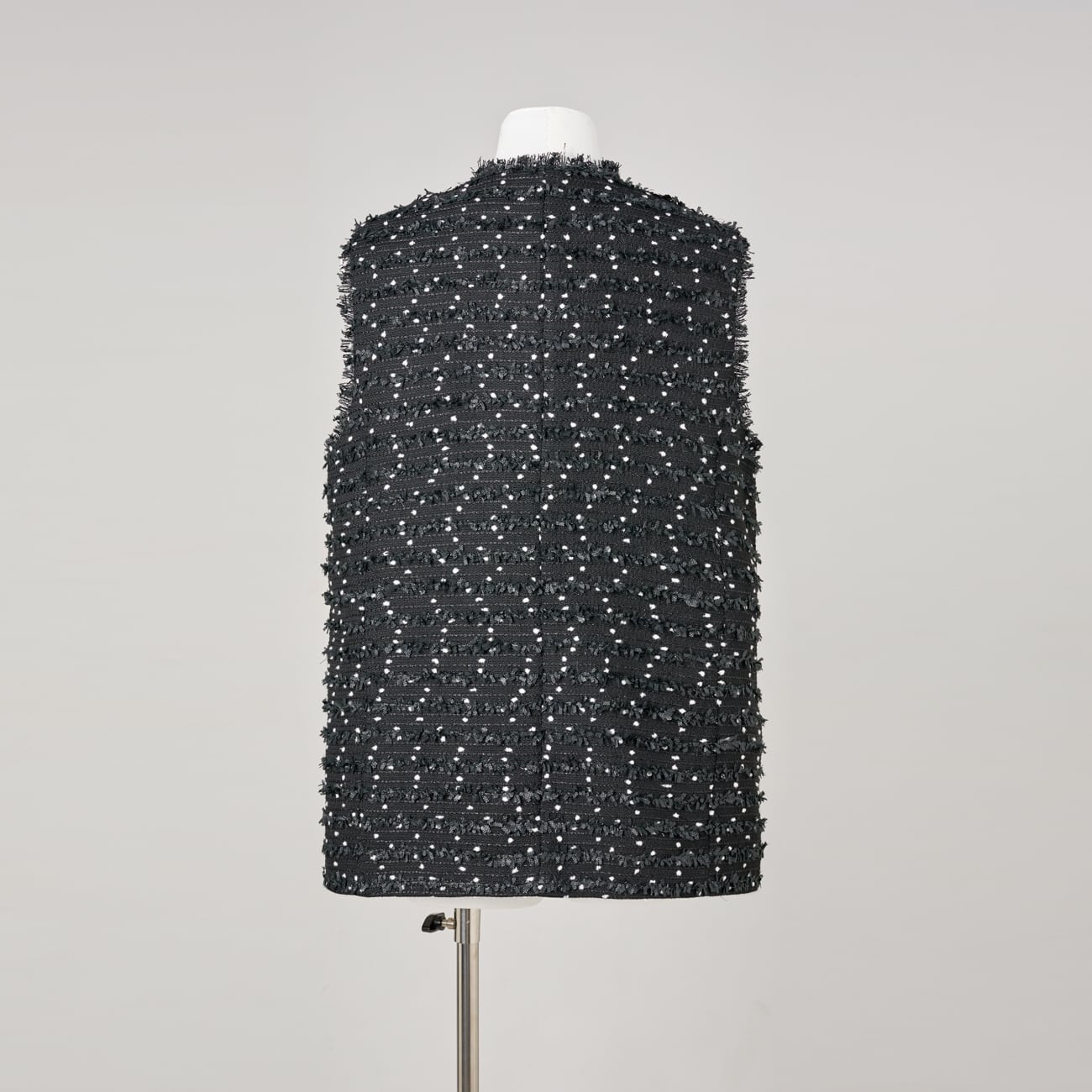 繊細なドット状の意匠糸を織り込んだ、立体感のあるツイード素材を使用したジレ。
