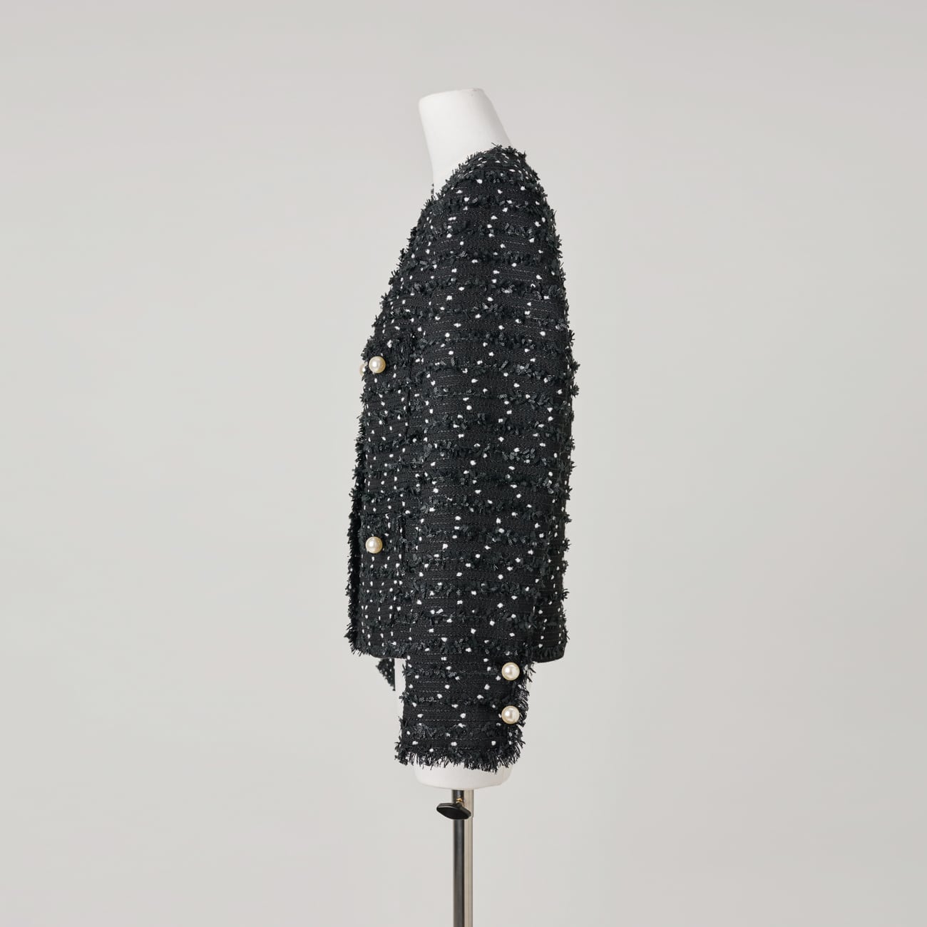 フロントには大きめのパールボタンをあしらい、ツイードの表情に上品なアクセントをプラス。華やかさがありながらも派手になりすぎず、セレモニーにも日常にもなじみます。