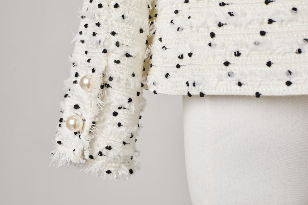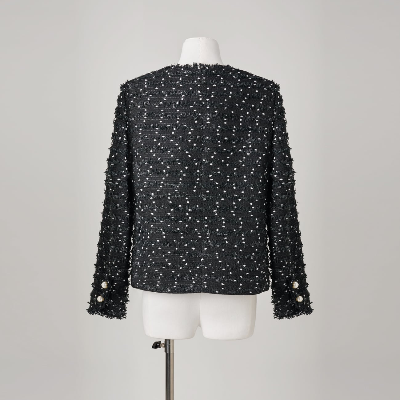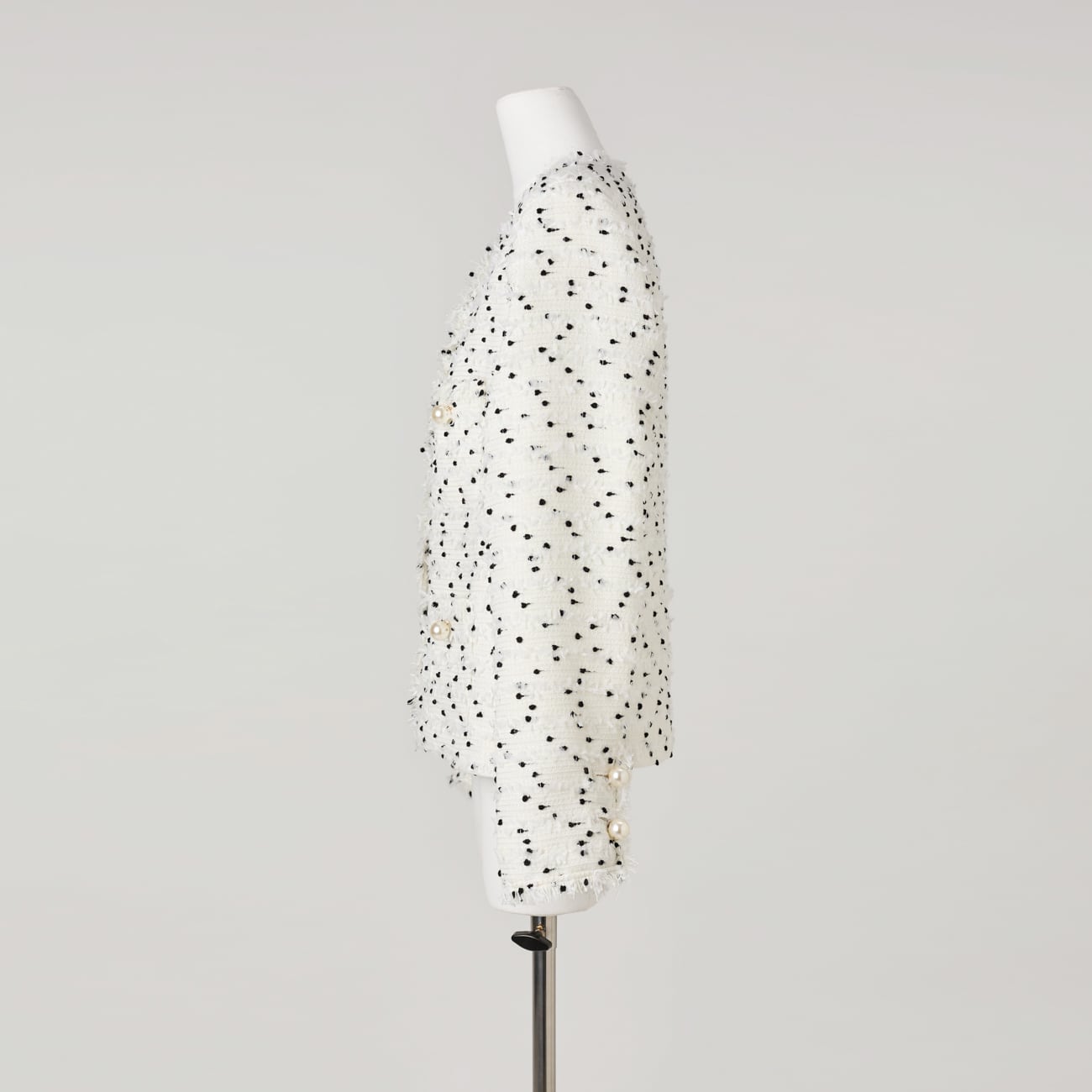 繊細なドットのような立体感が浮かび上がるツイード生地を使用したノーカラージャケット。ラメ糸とリボン状の意匠糸が織り込まれ、光を受けるたびに柔らかなきらめきを放ちます。近づくほどに上質さが伝わる、奥行きのある素材感です。