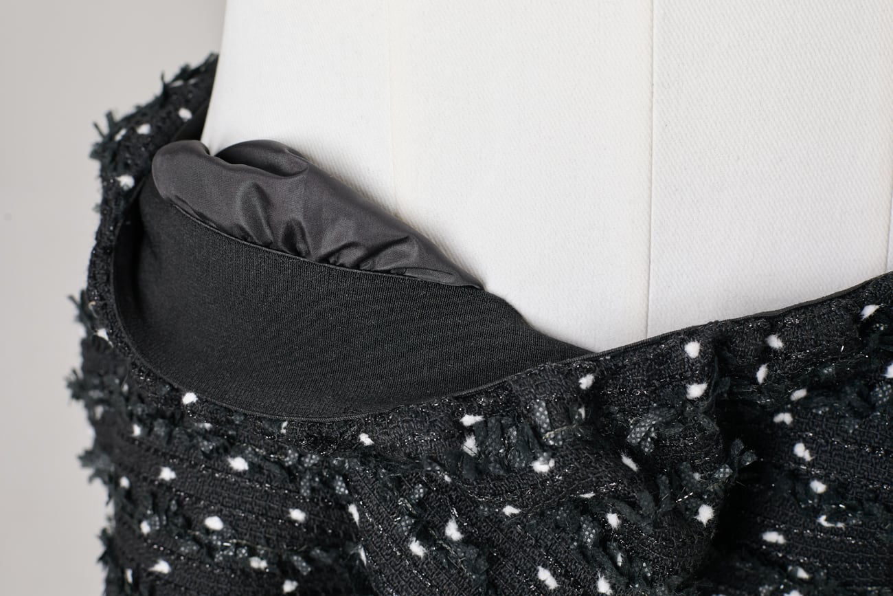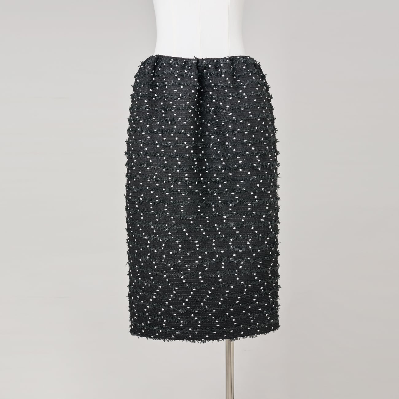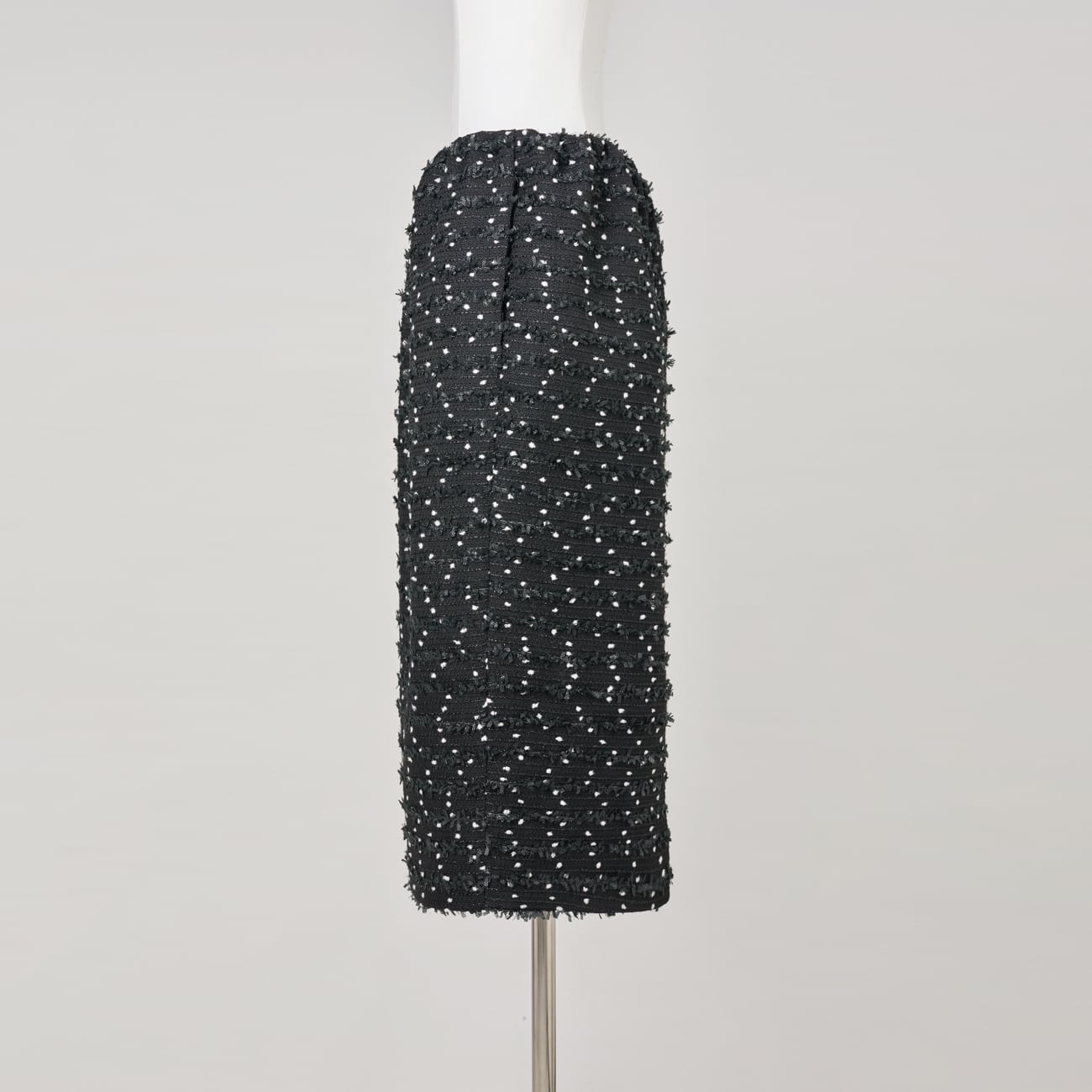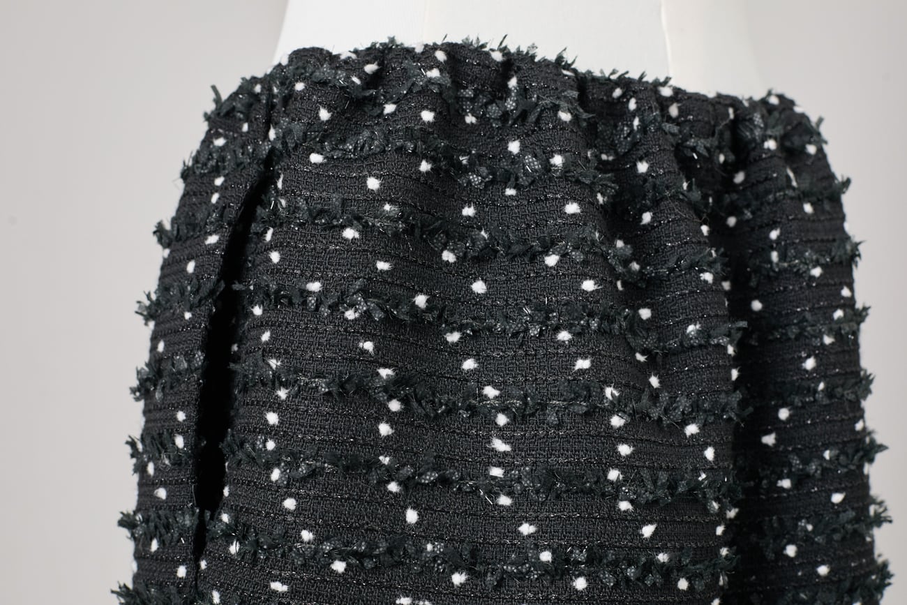 繊細なドット調が浮かび上がるツイード生地を使用した、セレモニー対応のストレートミディアムスカート。ラメ糸とリボン状の意匠糸を織り込み、光を受けるたびに上品なきらめきを放ちます。華やかでありながら落ち着きを保つ、格式ある質感です。