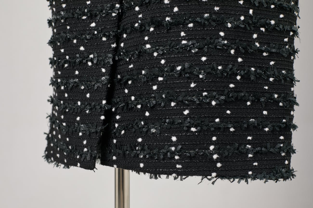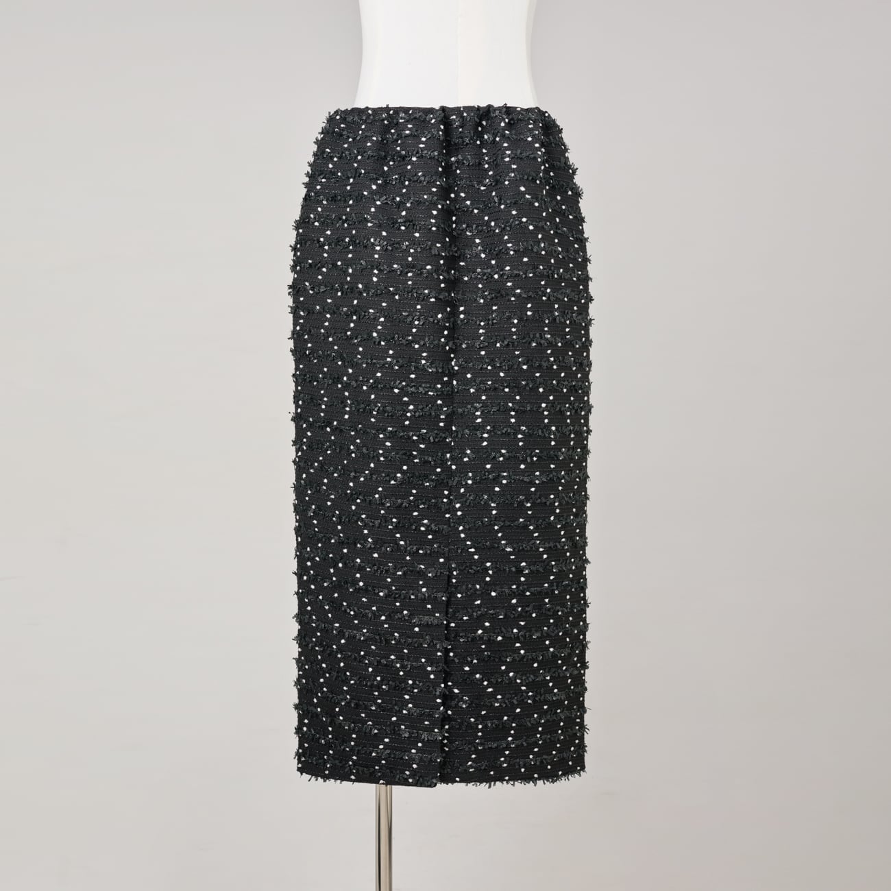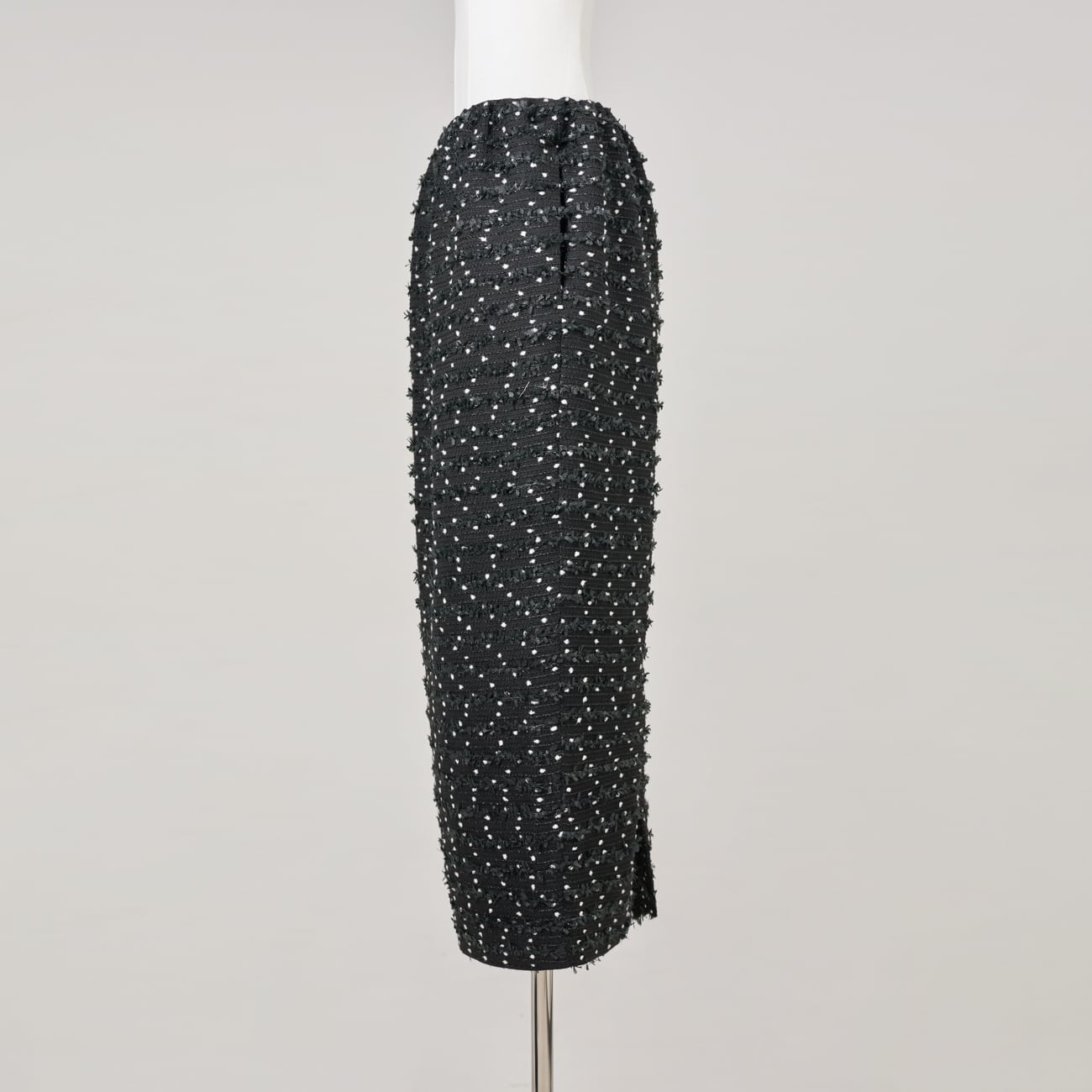 繊細なドット調が浮かび上がるツイード生地を使用した、構築的なストレートロングスカート。ラメ糸とリボン状の意匠糸を織り込み、光を受けるたびに奥行きのあるきらめきを放ちます。単色でありながら平坦にならない、立体的なテクスチャーが存在感を生み出します。