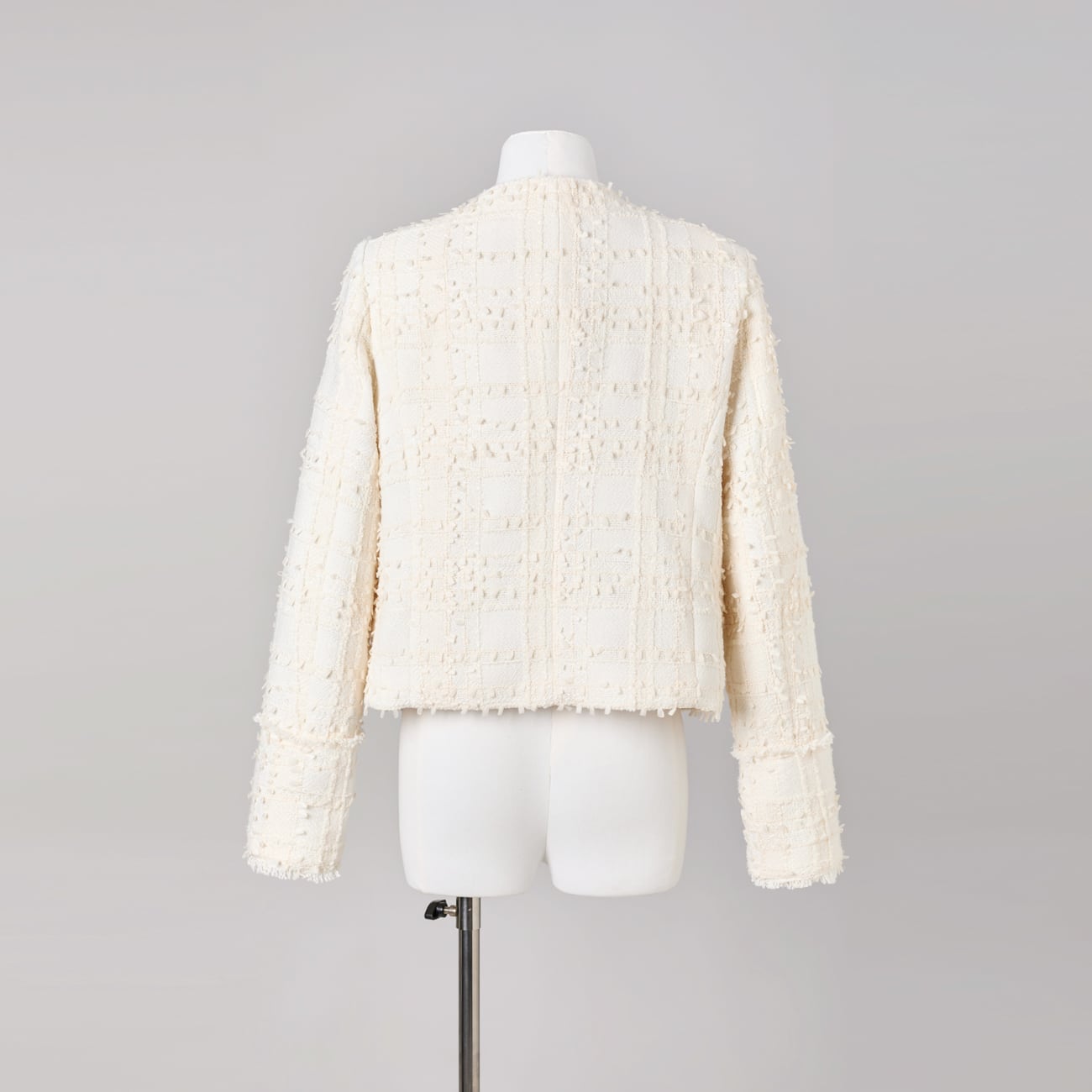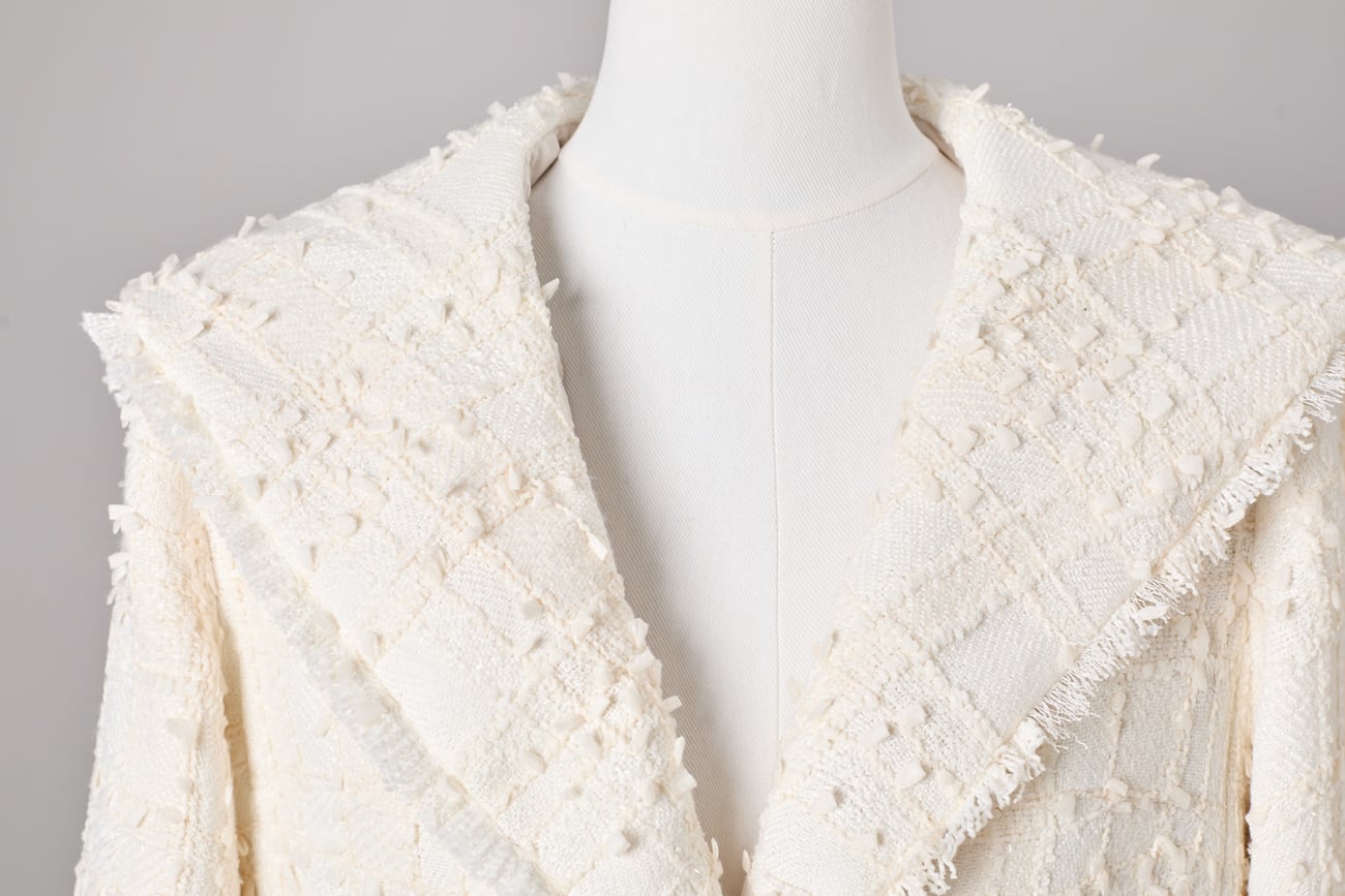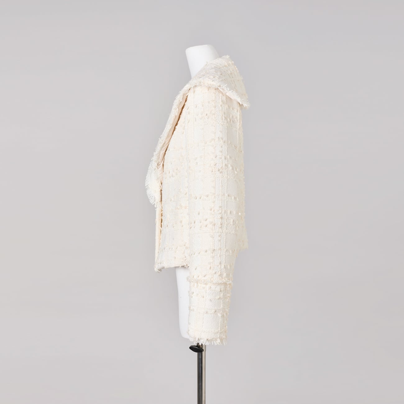 襟元や裾、袖口にはフリンジ仕上げを施し、輪郭にやわらかなニュアンスをプラス。セーラーカラーで華やかに、ノーカラーで端正に。どちらの着こなしでも上品さを保ちます。