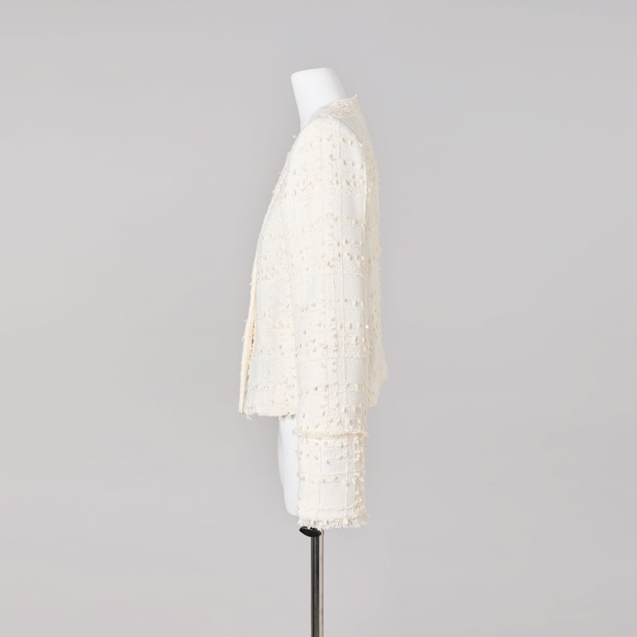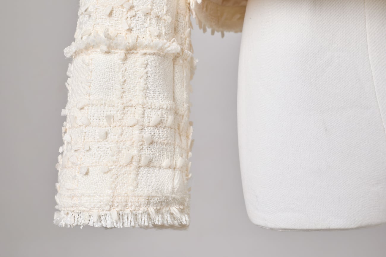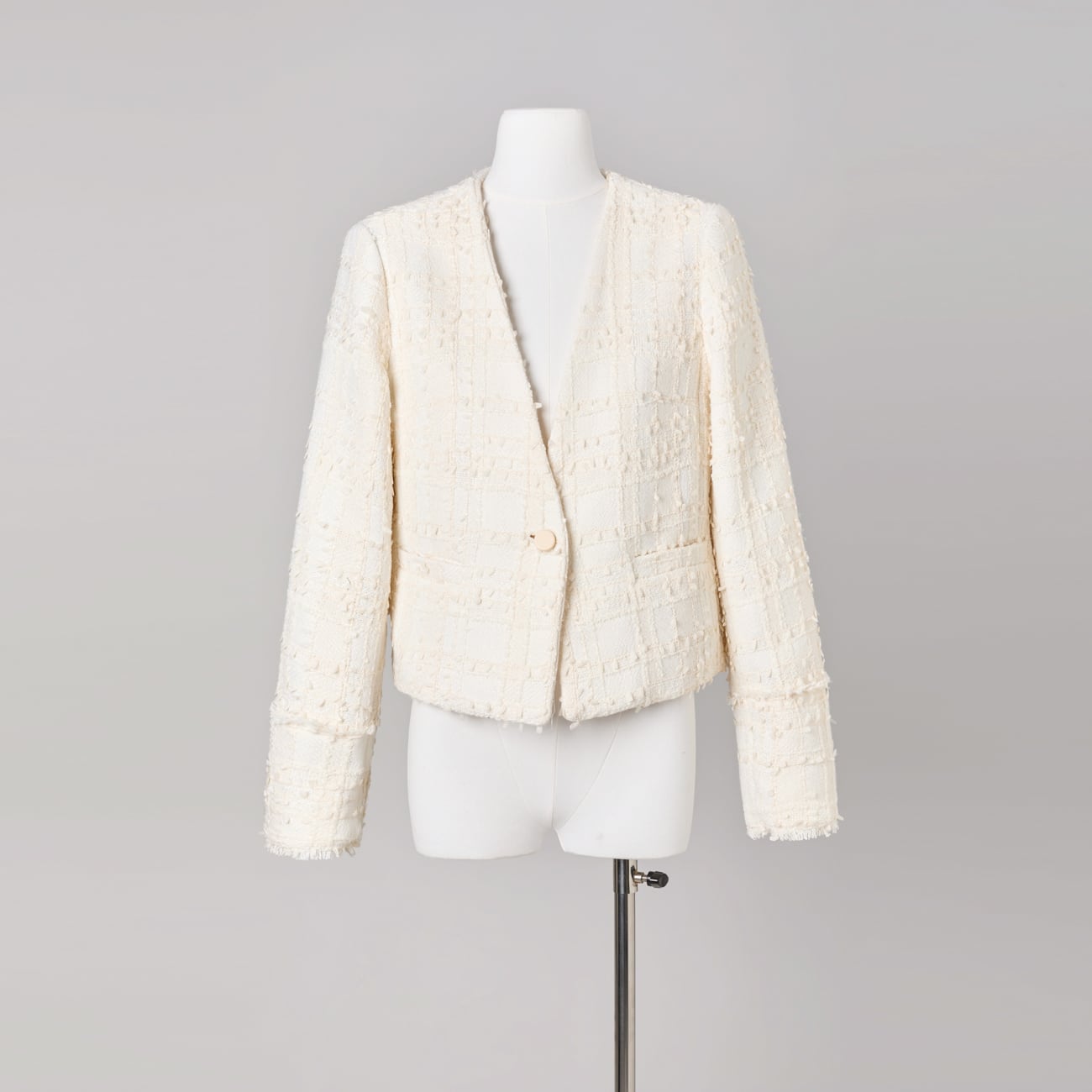 襟元や裾、袖口にはフリンジ仕上げを施し、輪郭にやわらかなニュアンスをプラス。セーラーカラーで華やかに、ノーカラーで端正に。どちらの着こなしでも上品さを保ちます。