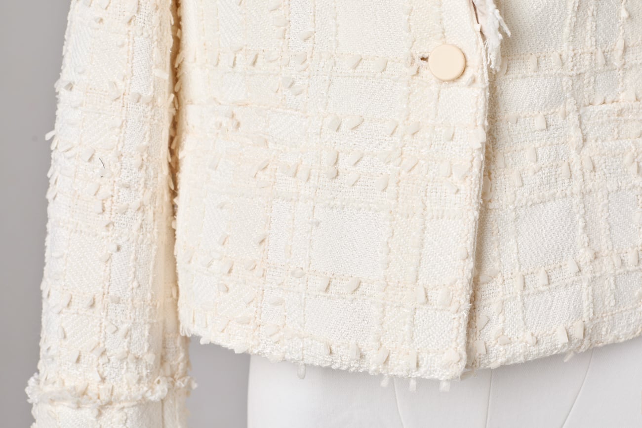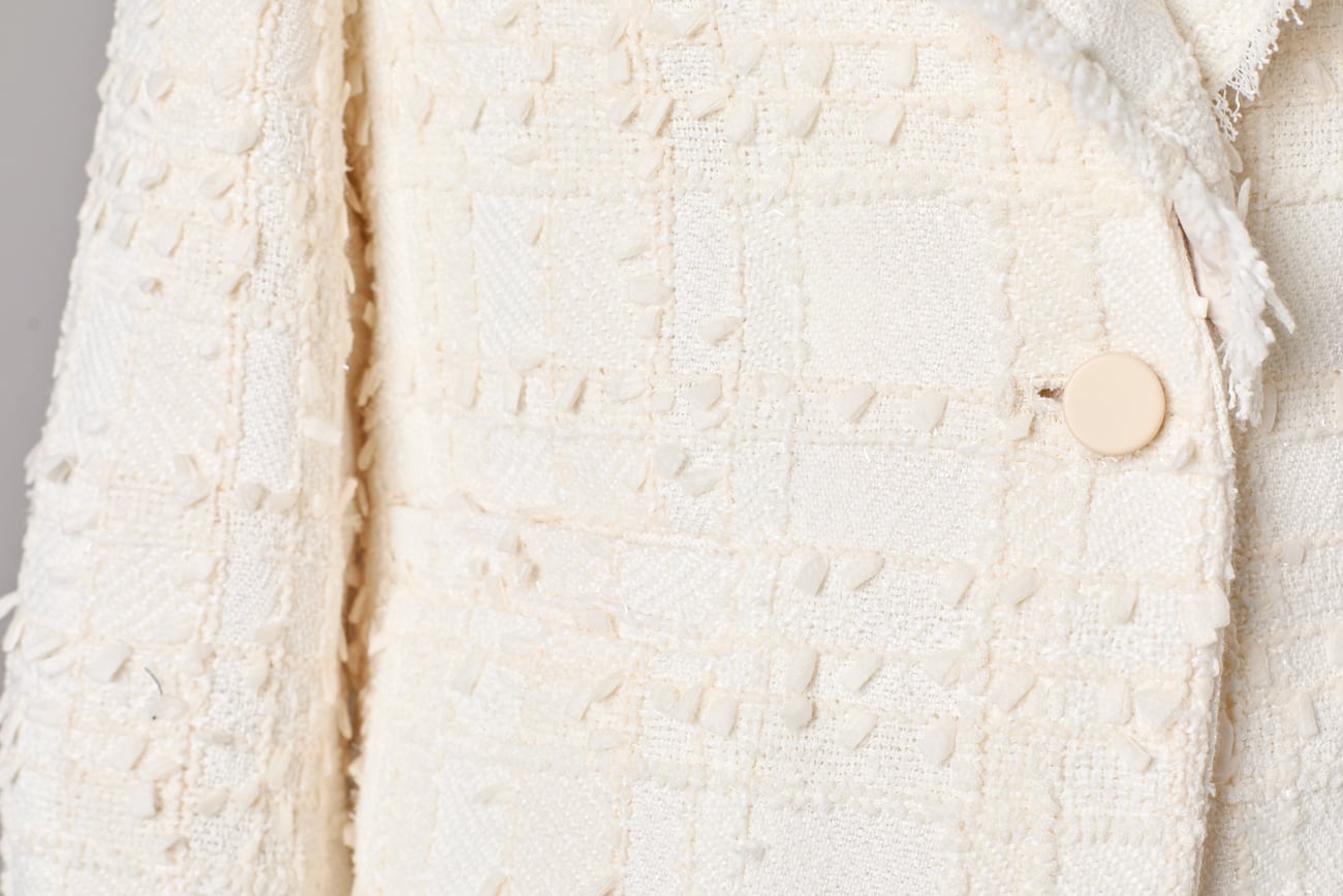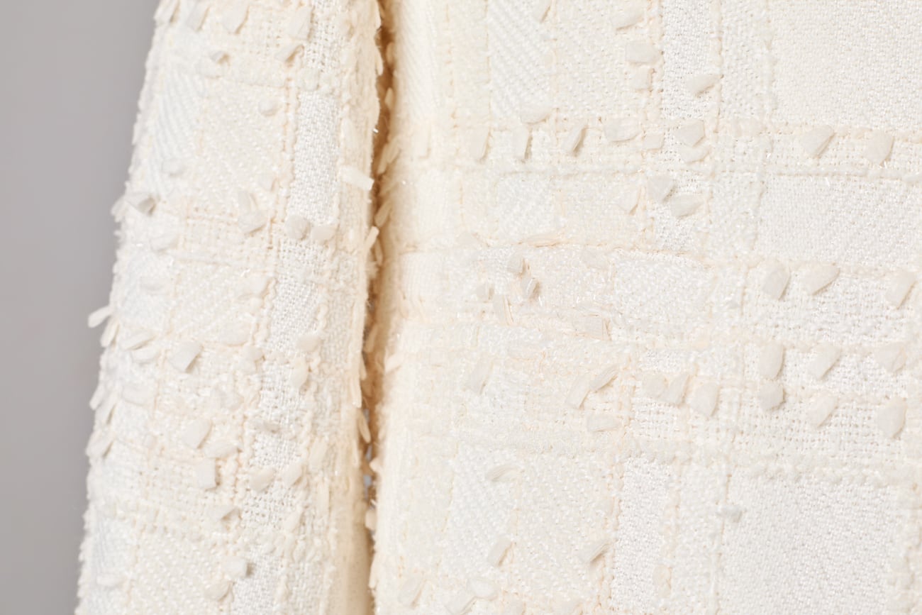 立体感のあるツイード生地は、程よい厚みと密度を備えた上質素材。織りの中に意匠糸を織り込み、光を受けるたびに奥行きのある柔らかな表情を生み出します。