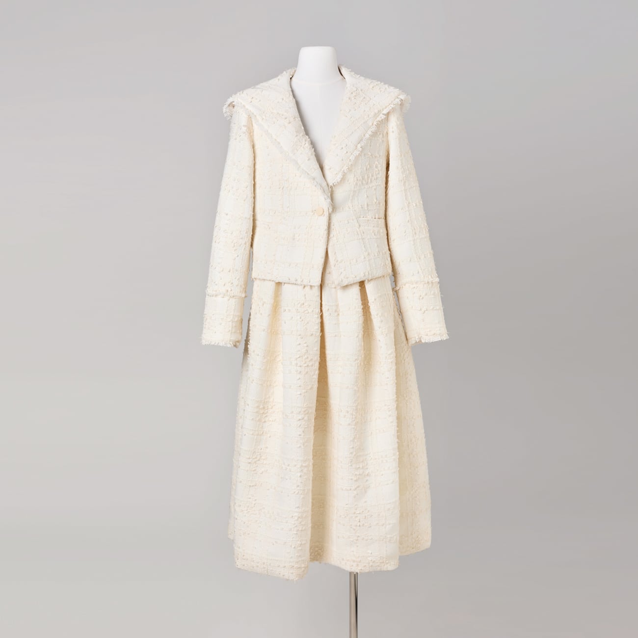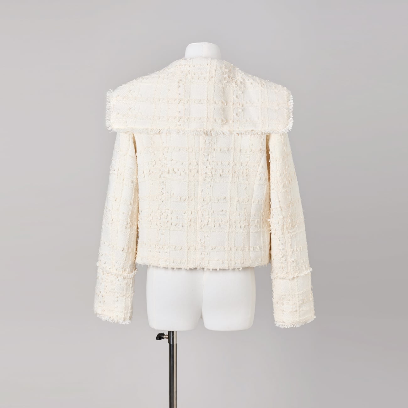 大きめに設計したセーラーカラーが印象的なツイードジャケット。取り外し可能な襟仕様で、ノーカラージャケットとしても着用いただけます。装いに合わせて表情を変えられる2Wayデザインです。