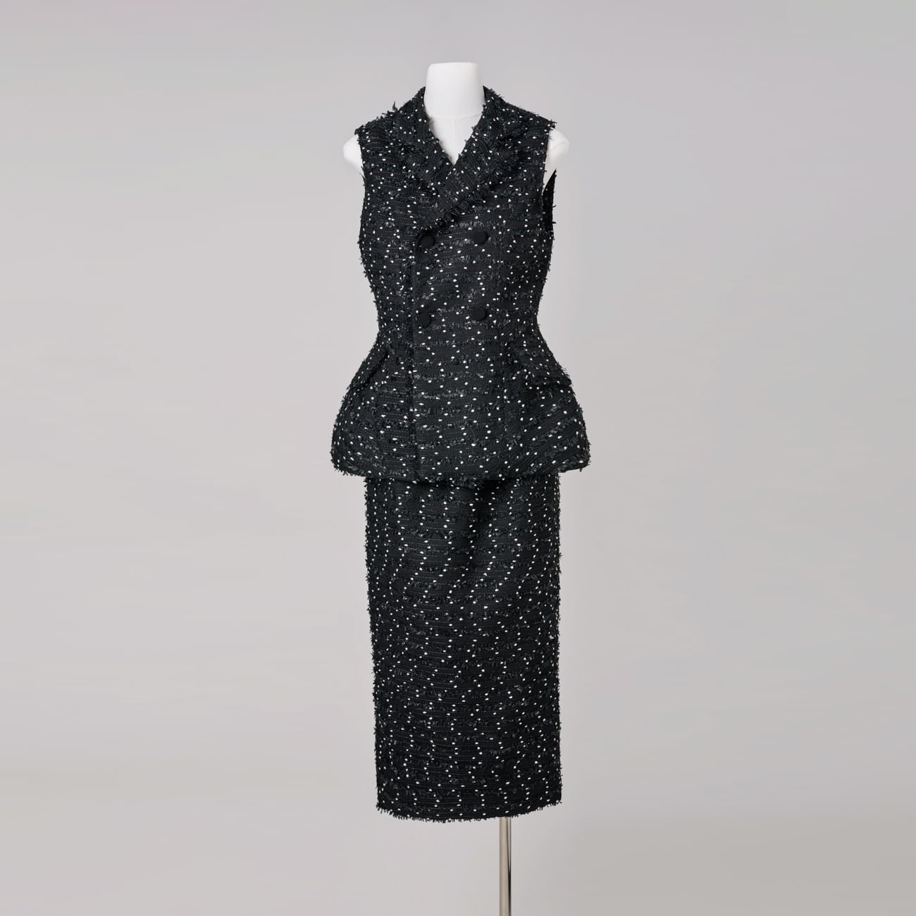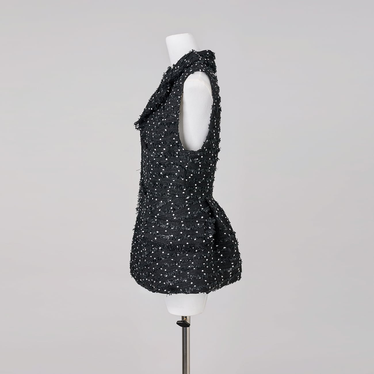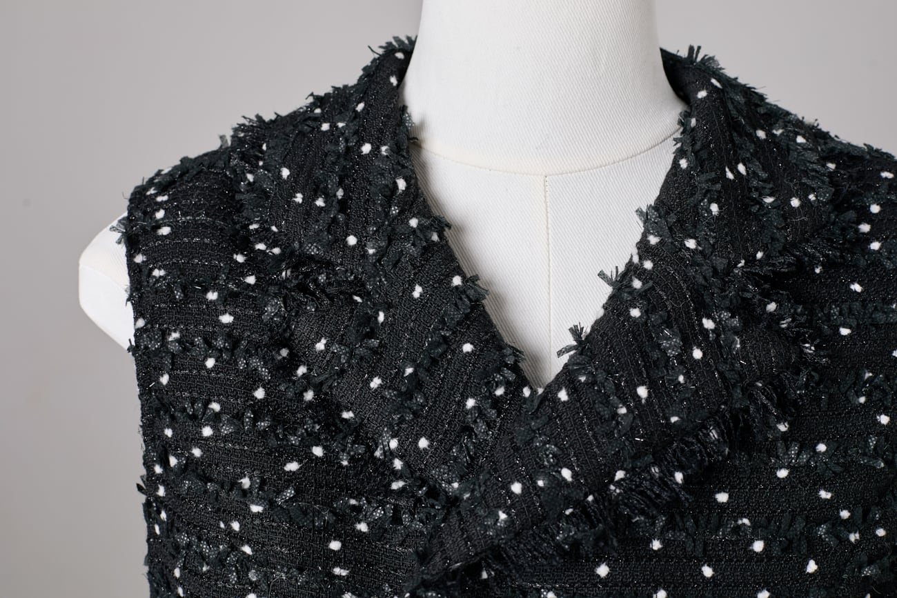 小さなドットのような立体感が印象的なツイード生地を使用した、ウエストシェイプ ペプラムジレ。同シリーズのジャケットと同様に、繊細なラメ糸とリボン状の意匠糸を織り込み、光を受けるたびに奥行きのあるきらめきを放ちます。