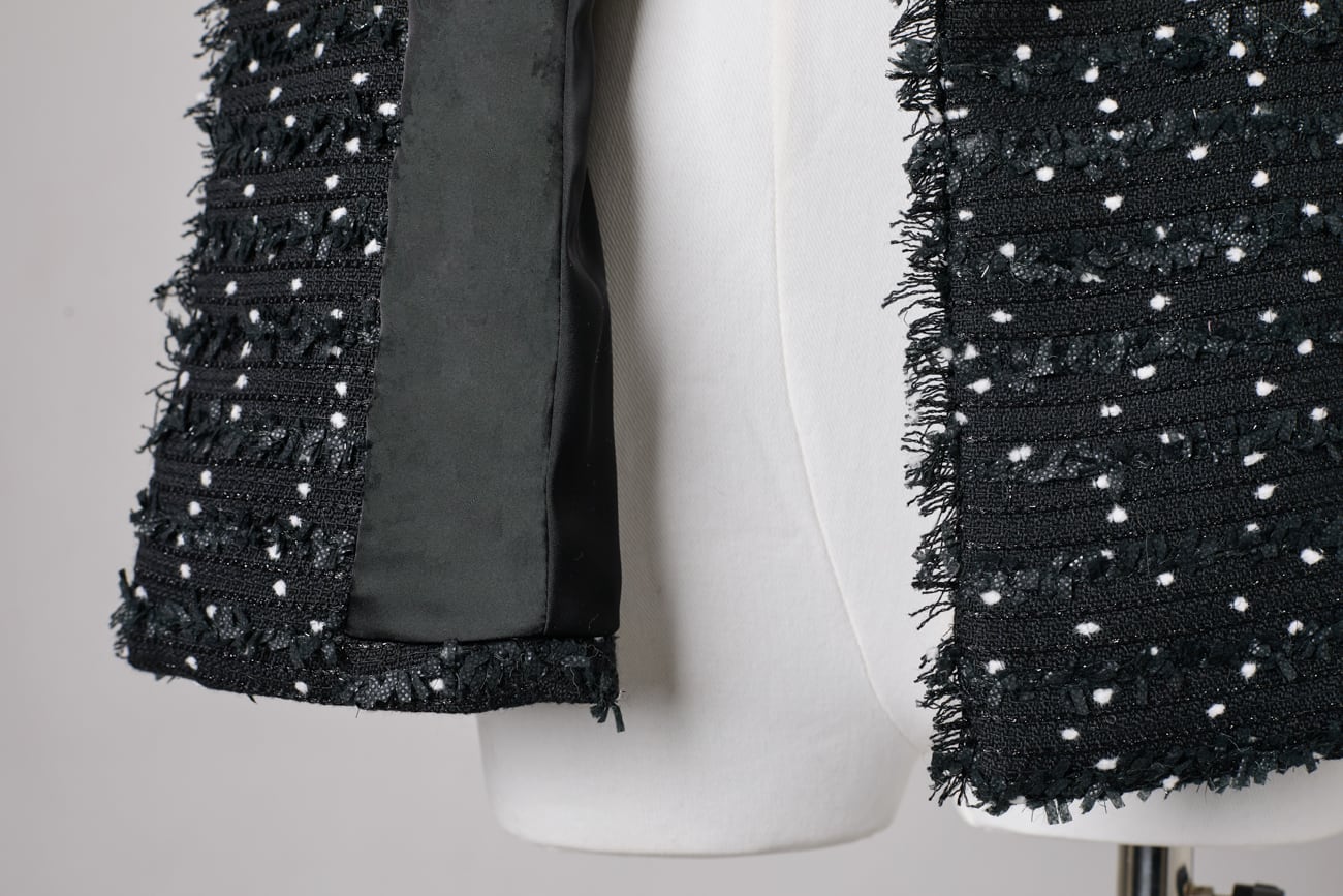 セレモニー、会食、ビジネスシーンまで対応。シルエットで魅せる、華やぎのあるツイードジレです。