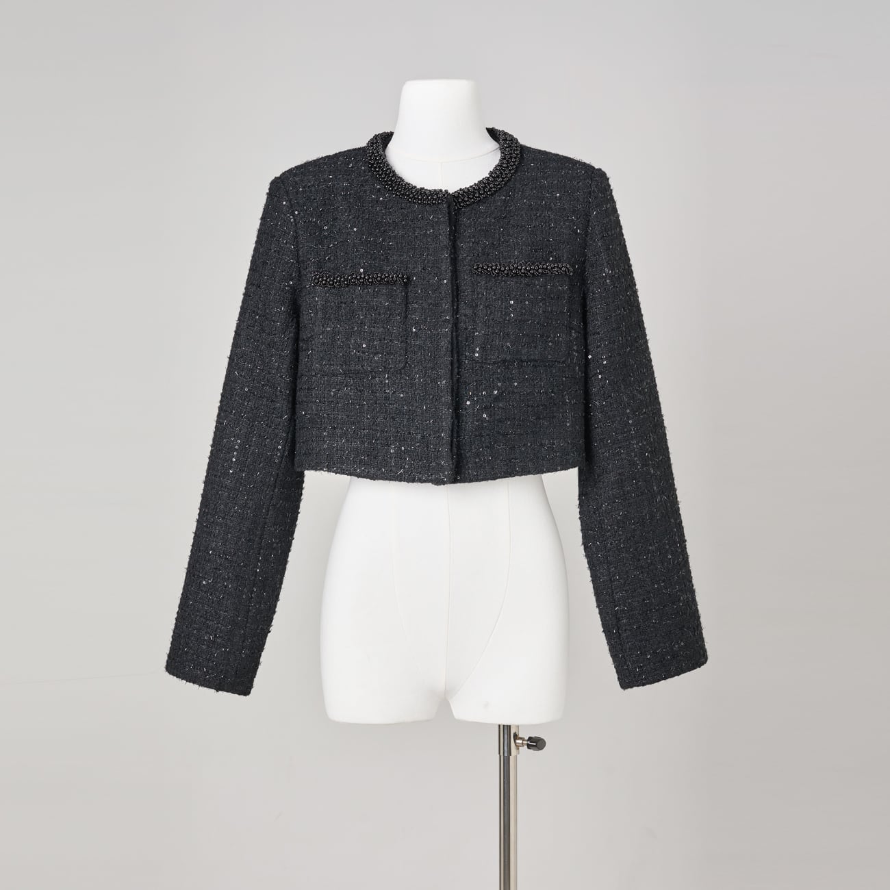 ハイウエストのスカートやパンツ、ワンピースとのバランスを前提に設計したショート丈。重心を高く見せることで自然なスタイルアップを叶えます。直線的なボックスシルエットが甘さを抑え、パールディテールとのコントラストが洗練された印象に。
