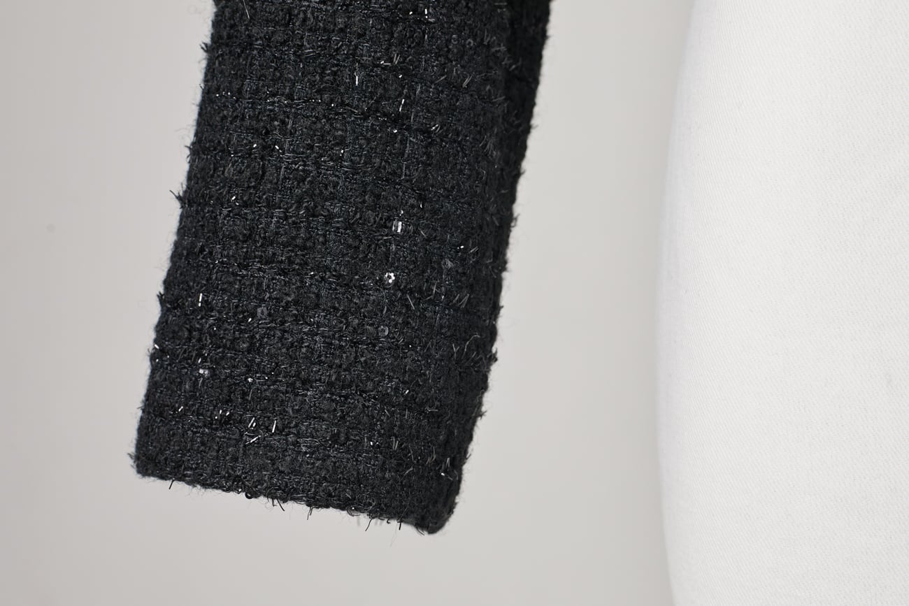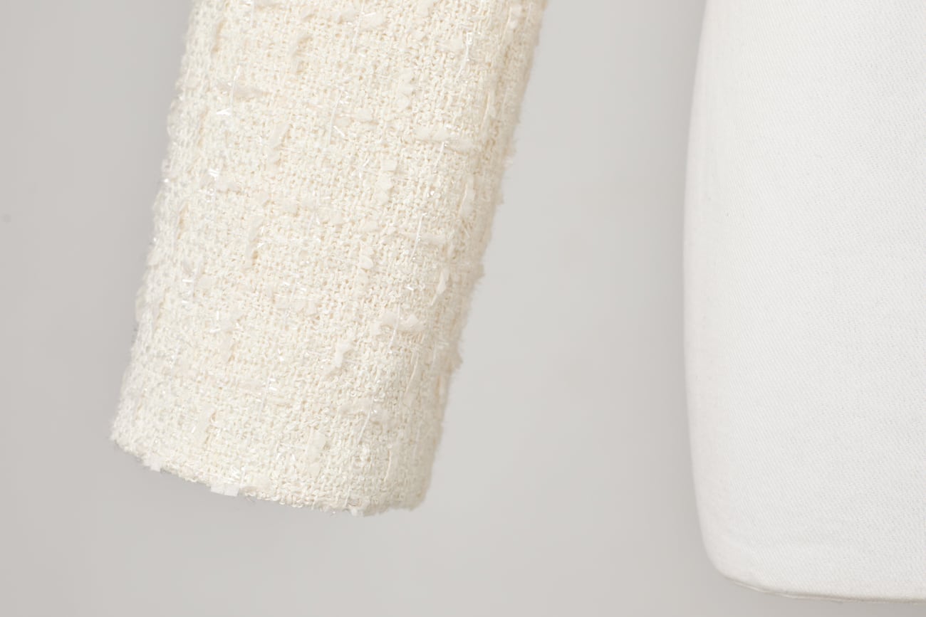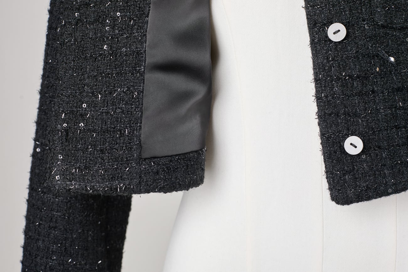 素材には、奥行きのある表情を持つツイード生地を使用。織りの中にさりげなくラメ糸を織り込むことで、光を受けた瞬間に上品なきらめきを演出します。過度に主張しない控えめな輝きが、セレモニーシーンでも浮かず、写真に残る場面でも美しく映える質感に仕上げました。裏地付きで袖通しも滑らかです。