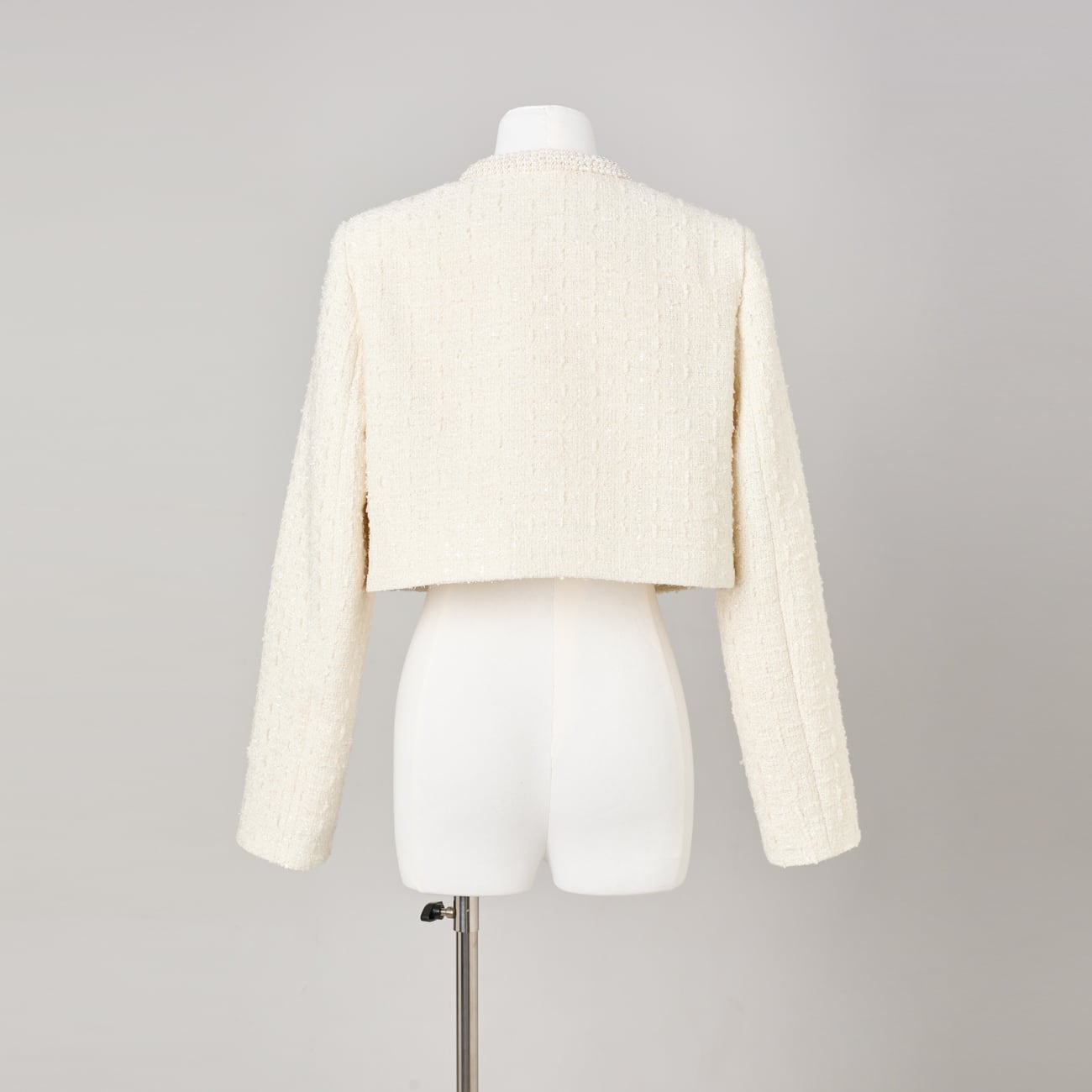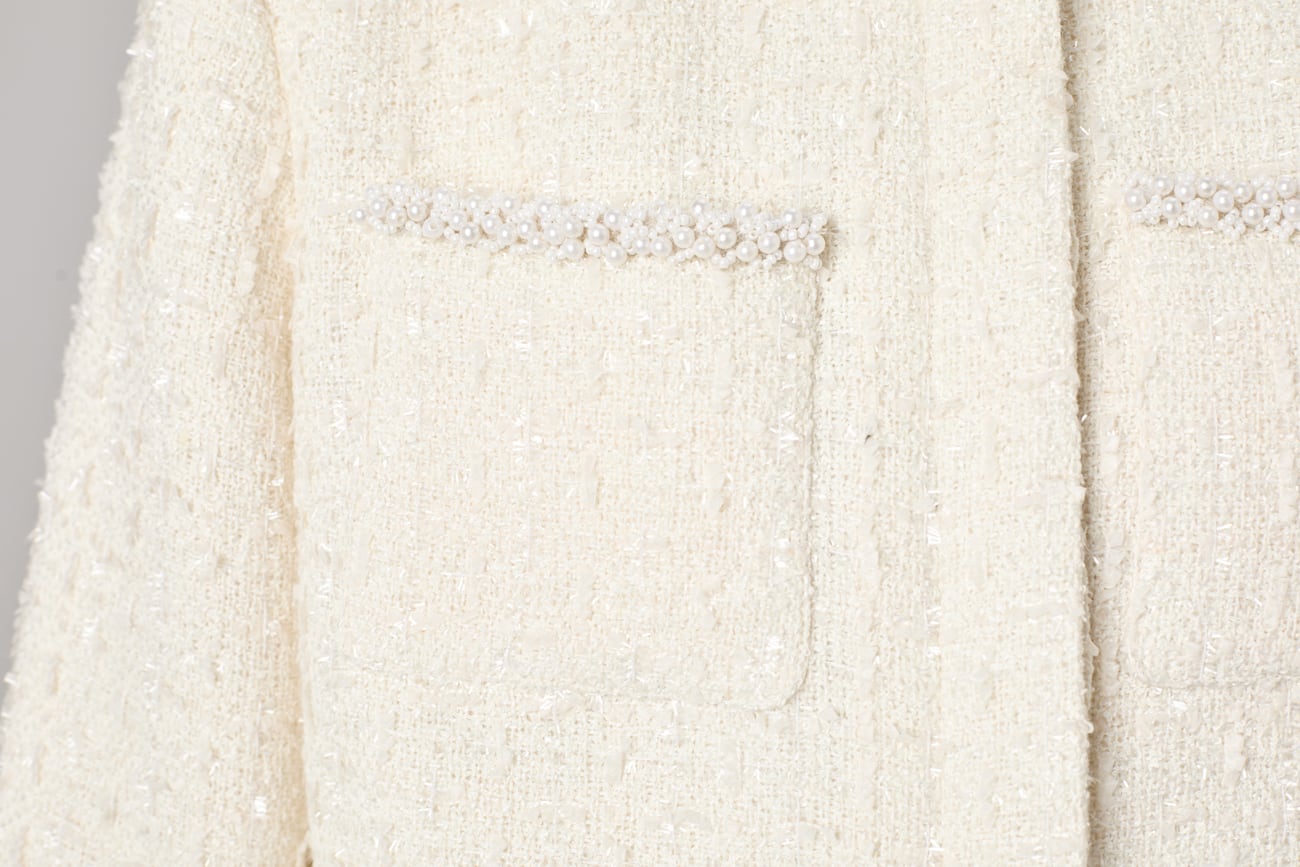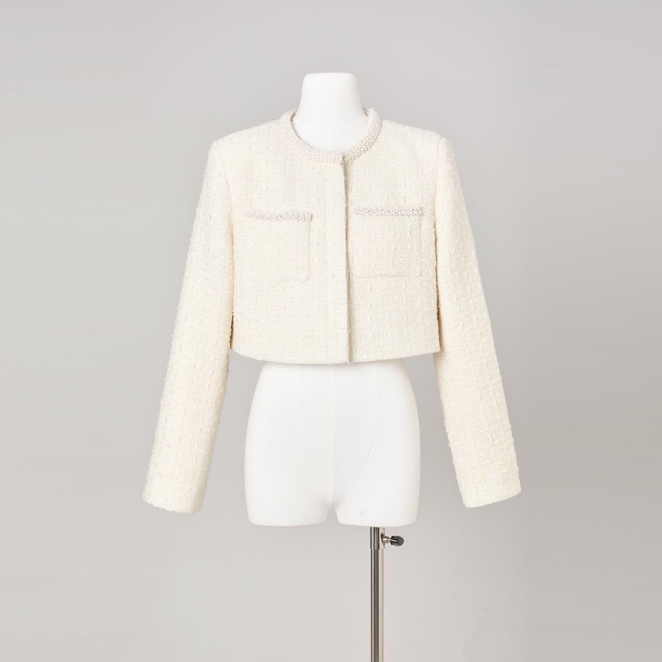首元とポケットにあしらったパールが静かな華やぎを添える、ショート丈のツイードジャケット。入学式・卒業式などのセレモニーやフォーマルシーンに対応しながら、どこかモードな空気を纏う一着です。