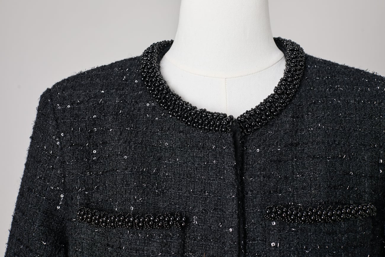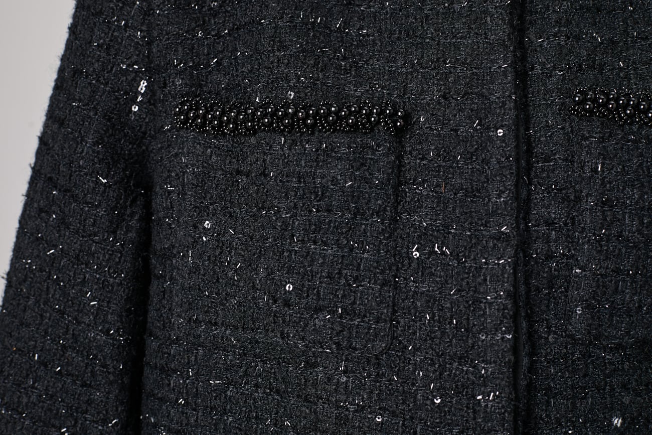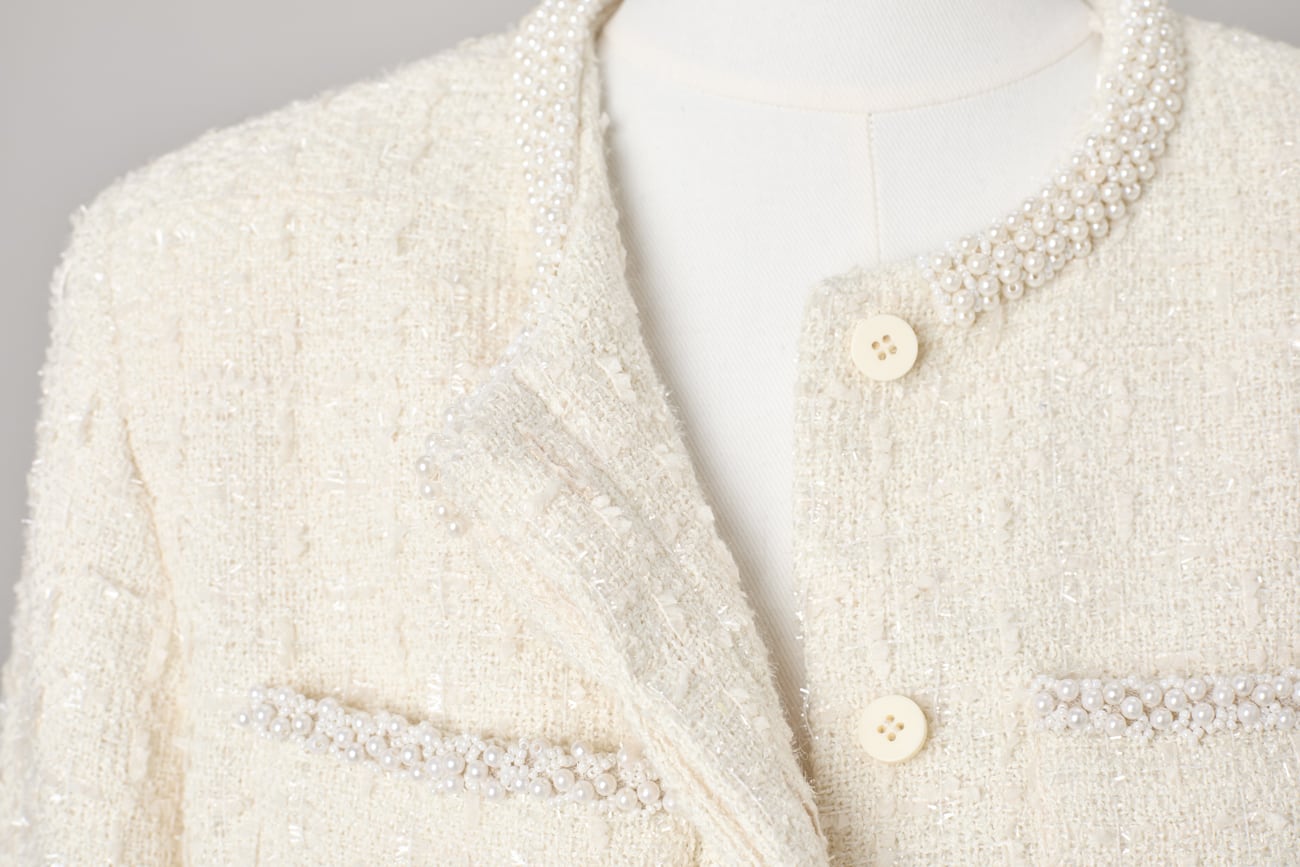 首元とポケットにあしらったパールが静かな華やぎを添える、ショート丈のツイードジャケット。入学式・卒業式などのセレモニーやフォーマルシーンに対応しながら、どこかモードな空気を纏う一着です。