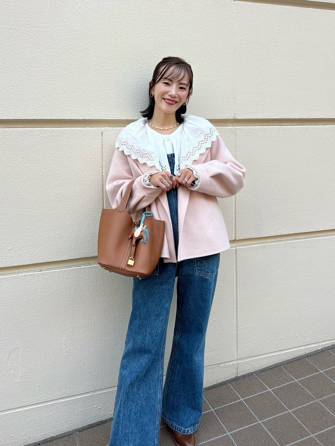 ビックカラーのブラウスを重ねて、春らしさを先取り