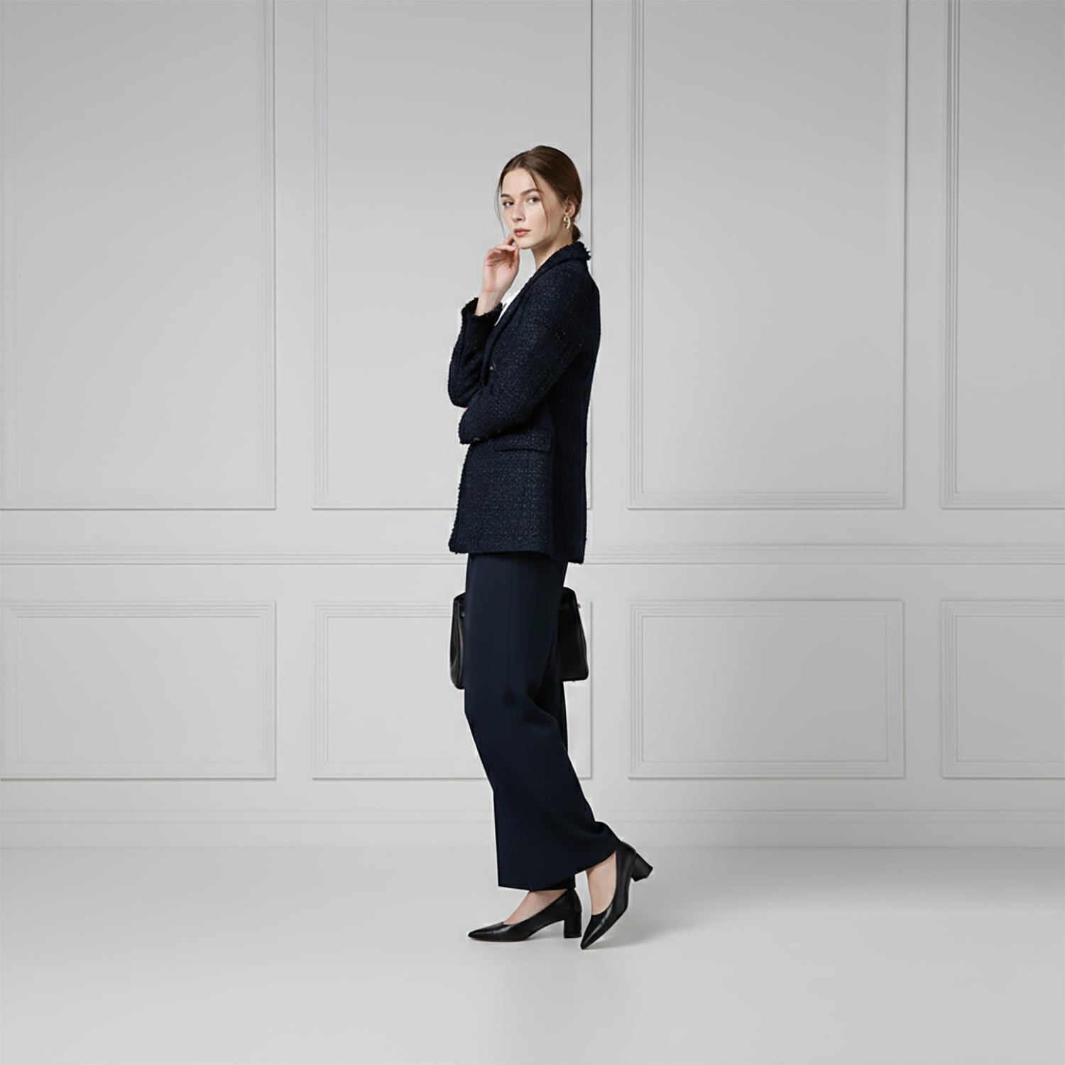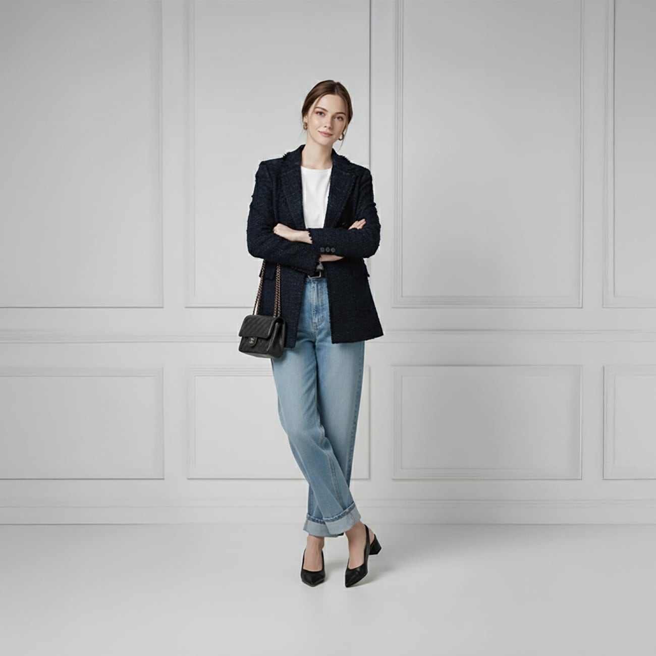 ツイードジャケット一着で、生活のさまざまなシーンに自然と溶け込みます。
